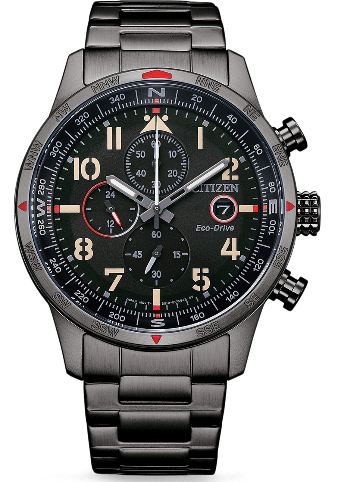 Hodinky Citizen Eco-Drive Pilot CA0797-84E mají pouzdro a náramek vyrobený z ušlechtilé oceli s PVD úpravou. Uvnitř pouzdra se skrývá in-house strojek Citizen B612, který disponuje světlem dobíjeným akumulátorem s rezervou chodu až 7 měsíců a také funkcí indikátoru vybití akumulátoru. Praktickou funkcí je pak ukazatel data na tradiční pozici 3. hodiny. Využít lze též funkci stopek, které mají plynulý chod sekundové ručky, nebo 24 hodinový subčíselník na pozici 9 hodiny.