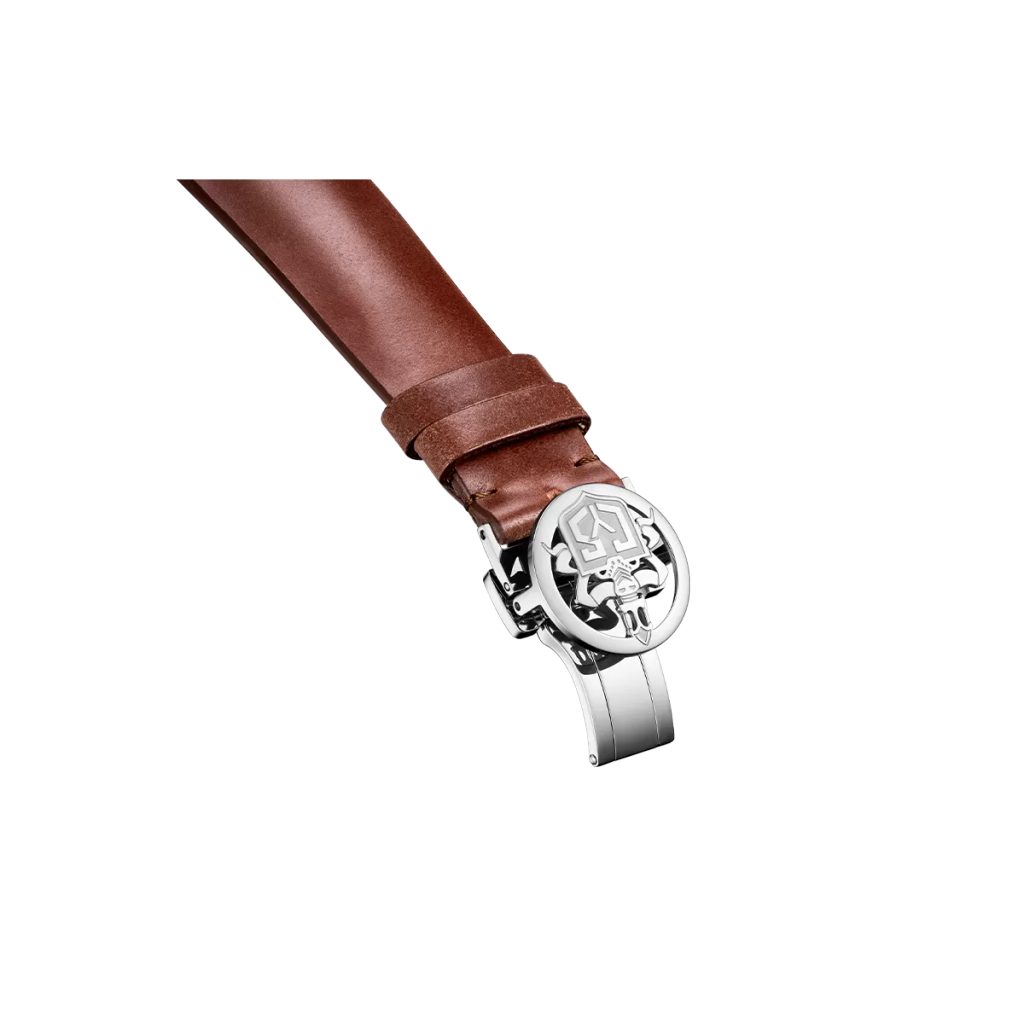 Přehledný, elegantní číselník je vyhotoven v odstínu světle hnědé barvy. Díky přehledným stříbrným ručkám máme dokonalý přehled o tom, jaký je čas. Na pozici 6 se nachází mimostředná vteřinová ručka. Vše chrání safírové sklíčko s antireflexní úpravou.