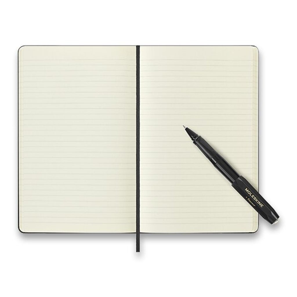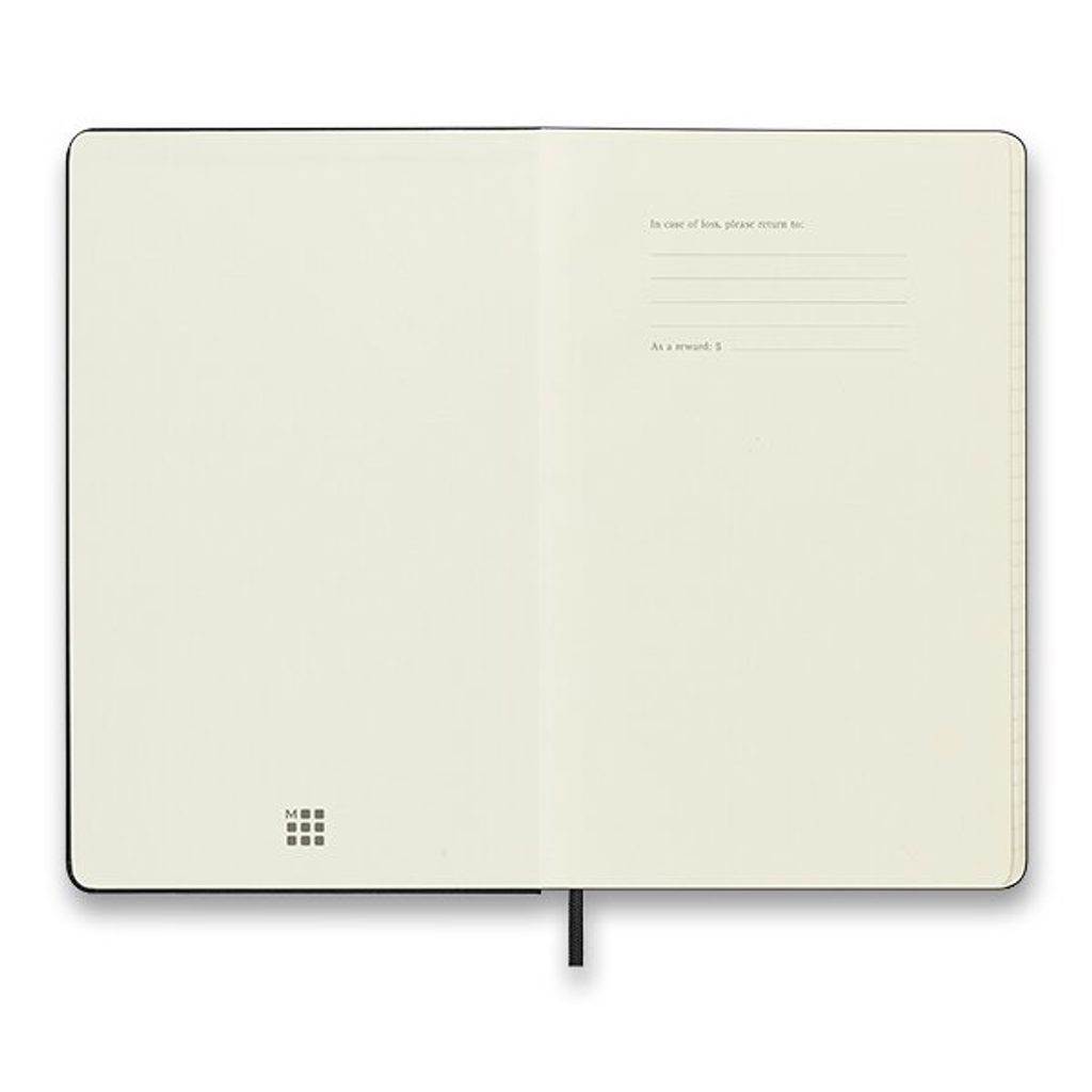 Zápisník má pevnou, ve hřbetu šitou vazbu v kartonových deskách a jsou obepnuté pružnou páskou proti samovolnému otevírání. Nechybí textilní záložka, leták s historií MOLESKINE a praktická kapsa na vizitky a dokumenty. Gramáž papíru je 70 g/m² , přičemž neobsahuje žádné kyseliny.