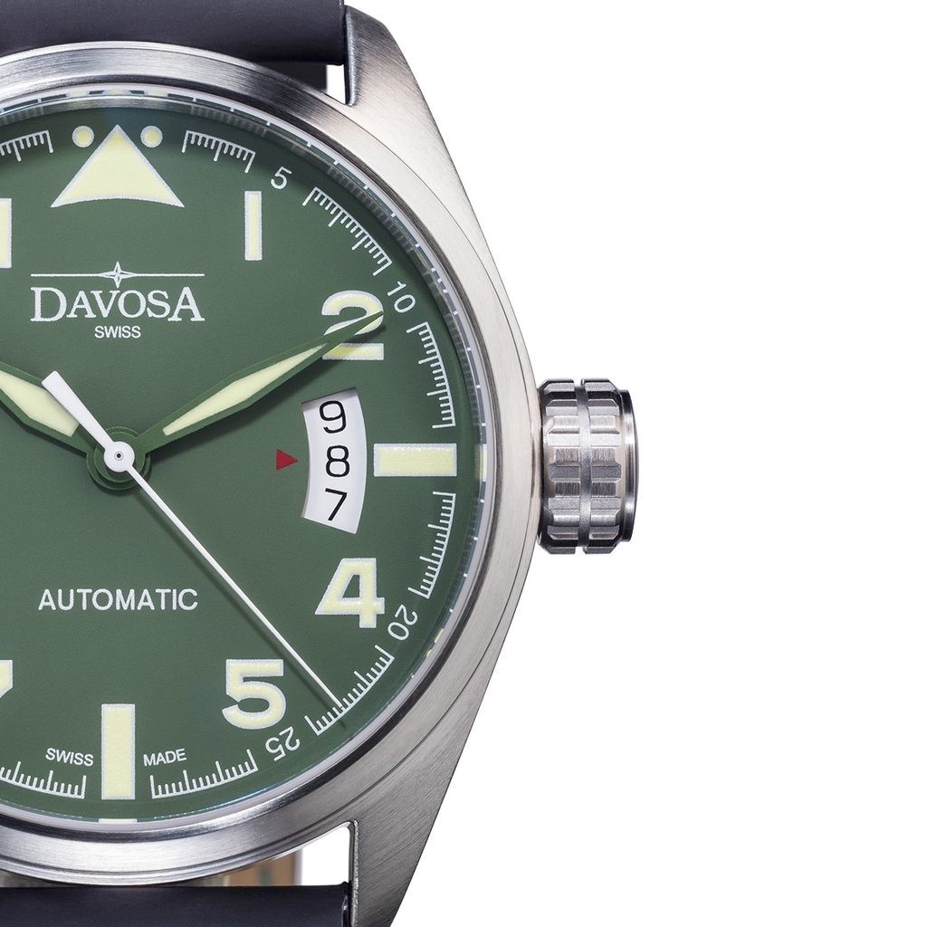 Davosa Military 161.511.74 zaujmou všechny, kteří hledají všestranné, skvěle čitelné hodinky v netradičním provedení. Zelený ciferník v leteckém provedení chrání safírové sklíčko. Uvnitř tepe klasický, mechanický strojek DAV 3021 (který vychází ze strojku ETA 2824 nebo Sellita SW 200) s frekvencí 4Hz a rezervou nátahu 38h. Jejich univerzálnost podtrhuje vodotěsnost 20ATM a šroubovací korunka i zadní víčko. Ocelové pouzdro doplňuje atraktivní, kožený řemen s gumovou vrstvou a v balení je také náhradní nylonový pásek.