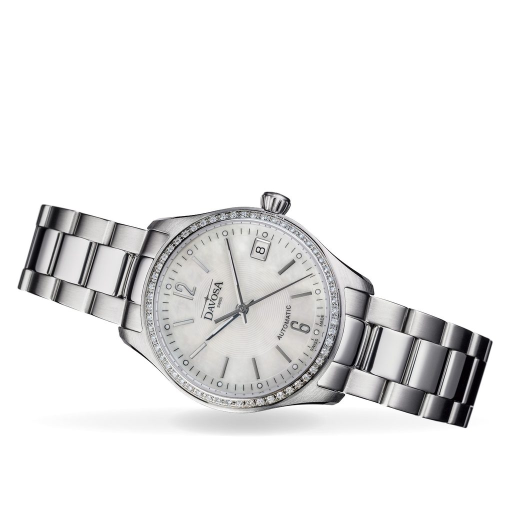 Pouzdro hodinek Davosa 166.191.10 je vyrobeno s ušlechtilé oceli a vhodně jej doplňuje ocelový náramek. Na lunetě pak najdeme zdobení v podobě 56 diamantů, které dělají z těchto hodinek vskutku okouzlující šperk. Uvnitř pouzdra tiká mechanický strojek DAV 3022 (který vychází ze strojku ETA 2836) s automatickým nátahem. Jeho práci na frekvenci 28800 polokmitů za hodinu lze pozorovat díky průhlednému dýnku. Na pozici 3. hodiny pak najdeme praktický ukazatel data.
