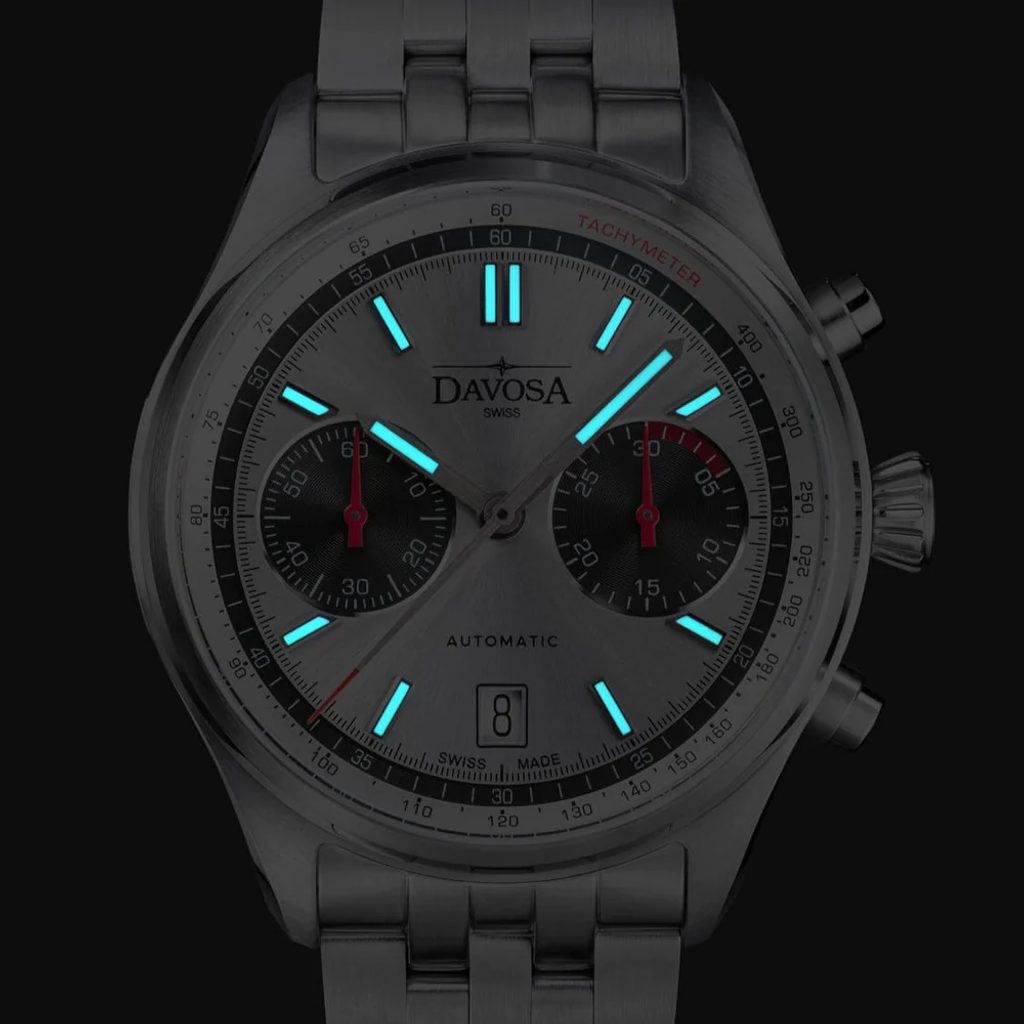 Kromě funkce stopek najdeme na hodinkách také ukazatel data na šesté hodině a sekundovou ručku na subciferníku na deváté hodině. Stupnice tachymetru na vnějším okraji číselníku navíc umožňuje přesné měření rychlosti na jeden kilometr. Pro lepší orientaci a čitelnost jsou ručky stopek a malá sekundová ručka zvýrazněny červenou barvou. Zobrazení času je stejně dobře čitelné i za zhoršené viditelnosti díky velkorysému nanesení vrstvy SuperLumiNova® BGW9 na ručně aplikované indexy, hodinovou a minutovou ručku.