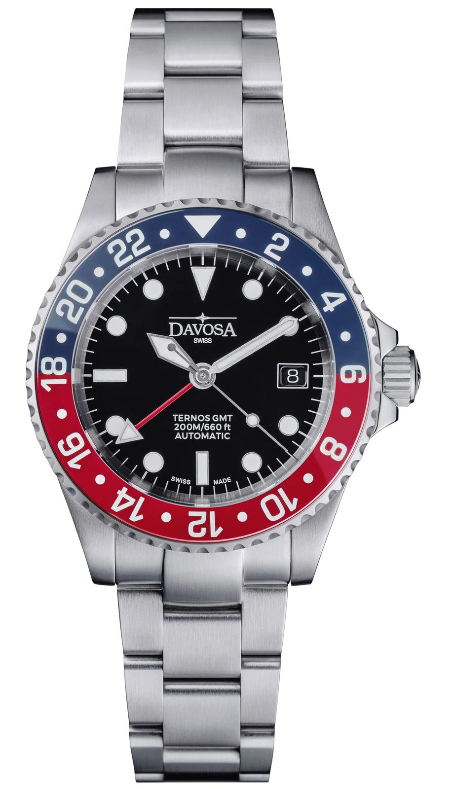Pouzdro hodinek Davosa Ternos GMT 161.563.60 je vyrobeno z ušlechtilé oceli a skrývá v sobě mechanický strojek DAV 3032 (který vychází ze strojku Sellita SW330-2) s automatickým nátahem. Ten pracuje na frekvencí 28800 polokmitů za hodinu (4Hz) a disponuje funkcí GMT - tedy ukazatelem druhé časové zóny formou čtvrté ručky. Odečítání druhého času lze jednoduše pomocí otočné GMT lunety s vložkou z High-Tech keramiky. Praktický je pak také ukazatel data na tradiční pozici 3 s podkladem v barvě číselníku. Přehledný číselník je chráněn safírovým sklíčkem, nemusíte se tedy bát jakéhokoli poškrábání. Čitelnost na přímém slunci zajišťuje antireflexní vrstva. Přehlednost ve tmě pak zajišťuje luminiscence SuperLumiNova® BGW9 na ručkách a indexech.