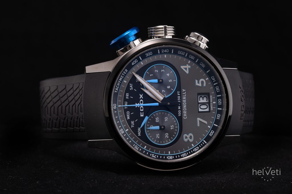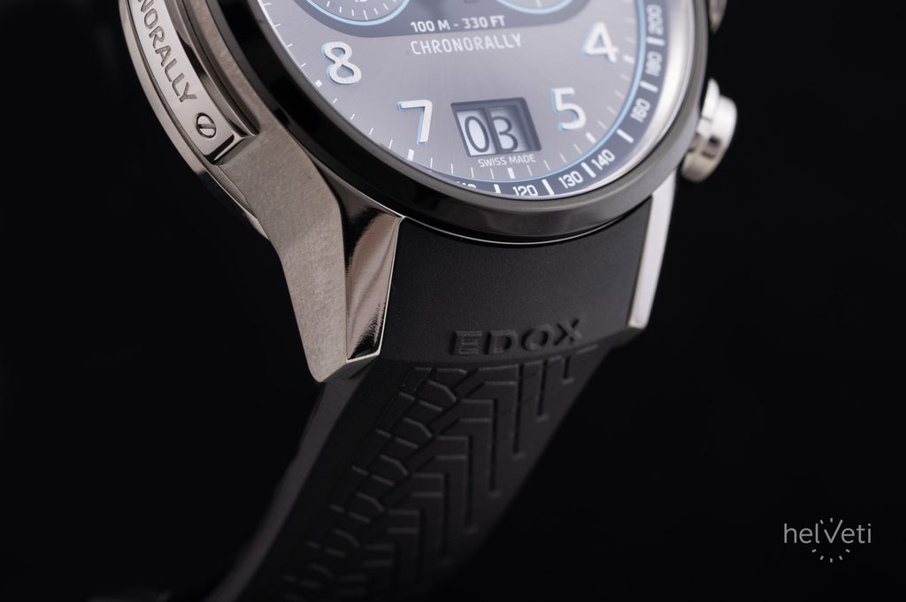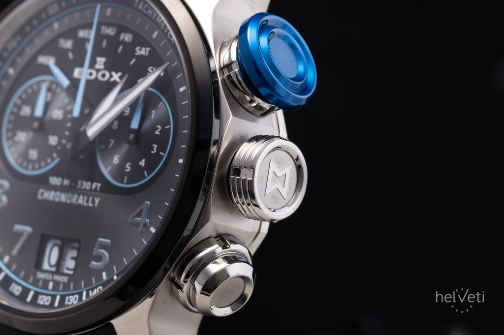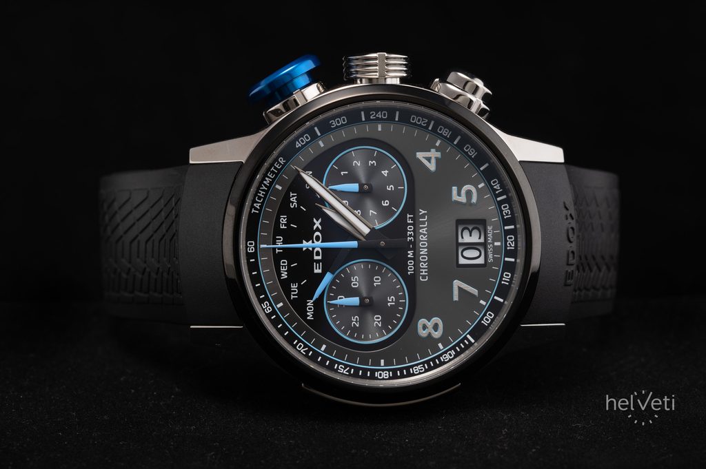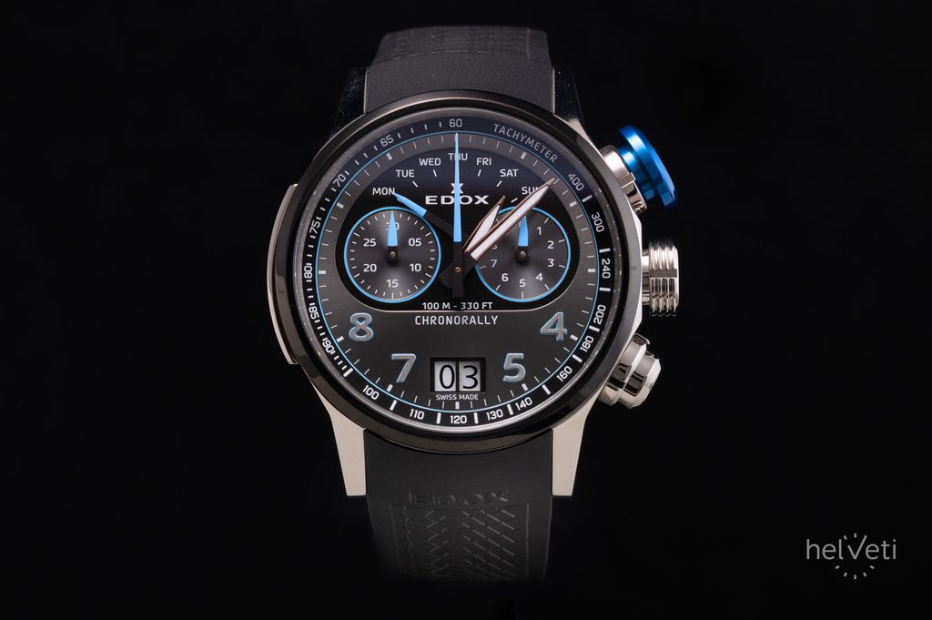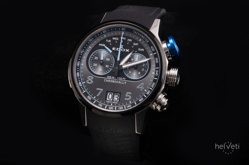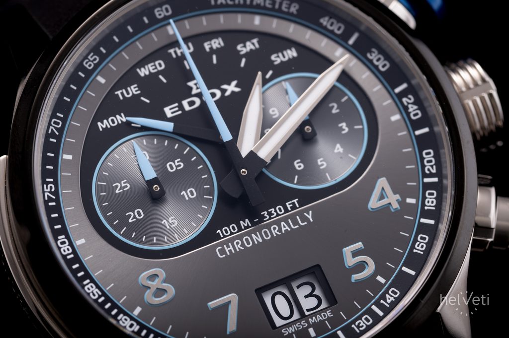 Hodinky EDOX Chronorally 38003-TINBU-GNBU pohání quartzový strojek Ronda 8020.N, který disponuje velkým datem na pozici 6. hodiny a ukazatelem dne v týdnu na 12. hodině s ručkou s retrográdní funkcí.