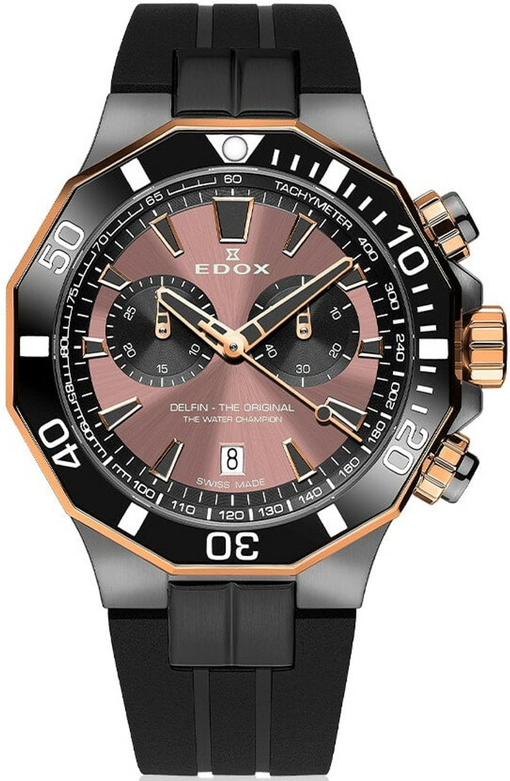 Sportovní pánské hodinky EDOX Delfin Quartz Chronograph 10112-357GRNCA-BRNR spadají do řady Delfin. Tato modelová řada je určena především milovníkům vodních sportů a potápěčských hodinek.