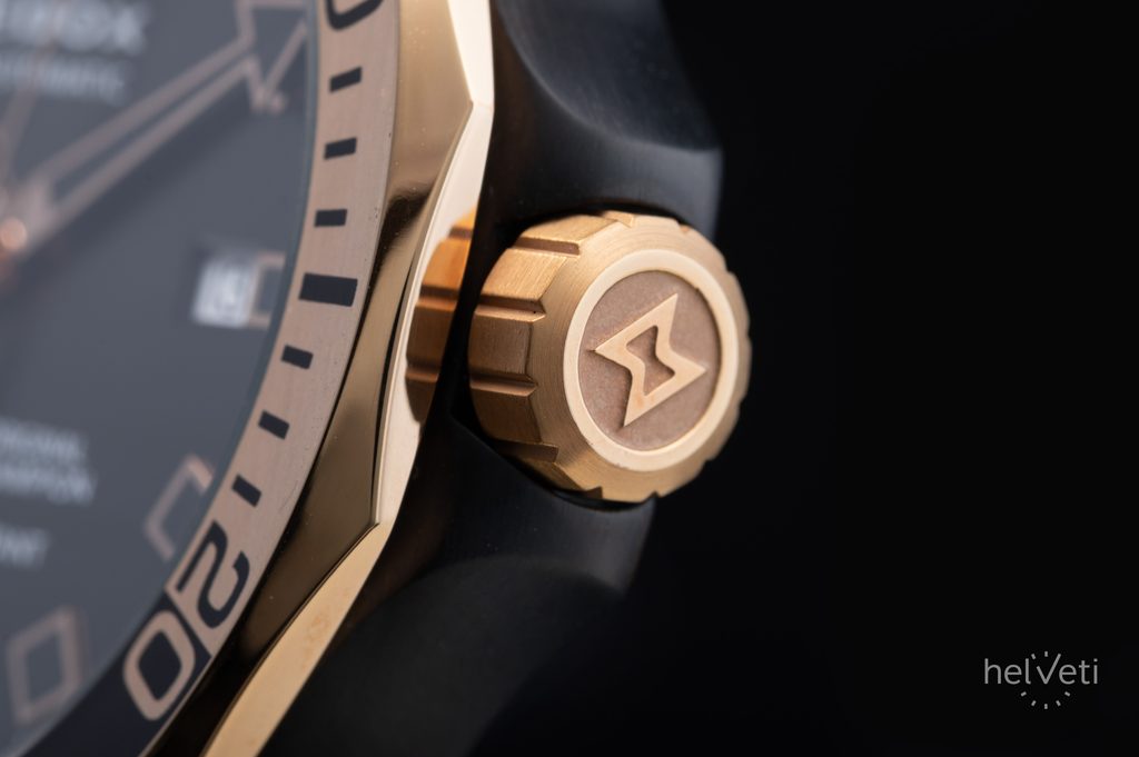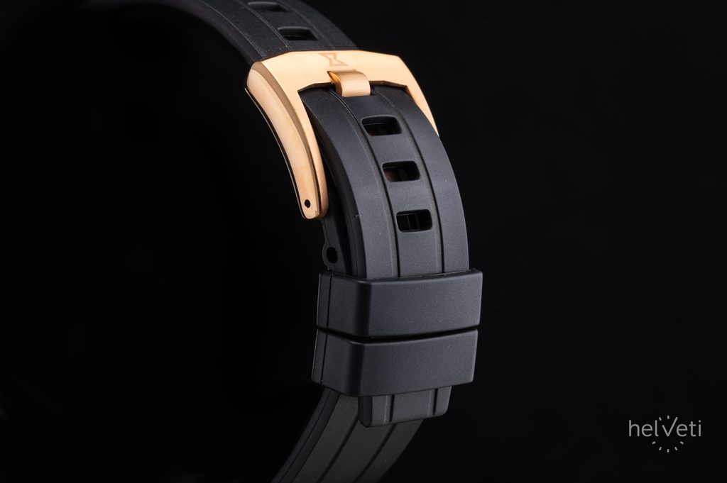 Pouzdro hodinek je vyrobeno z kvalitní ušlechtilé oceli s PVD úpravou vedené v černé barvě a barvě růžového zlata. Na pouzdro navazuje řemínek z přírodního kaučuku nejvyšší kvality, který je velmi příjemnými na nošení. Černý ciferník chrání safírové sklíčko, jež je odolné vůči jakémukoliv poškrábání.
