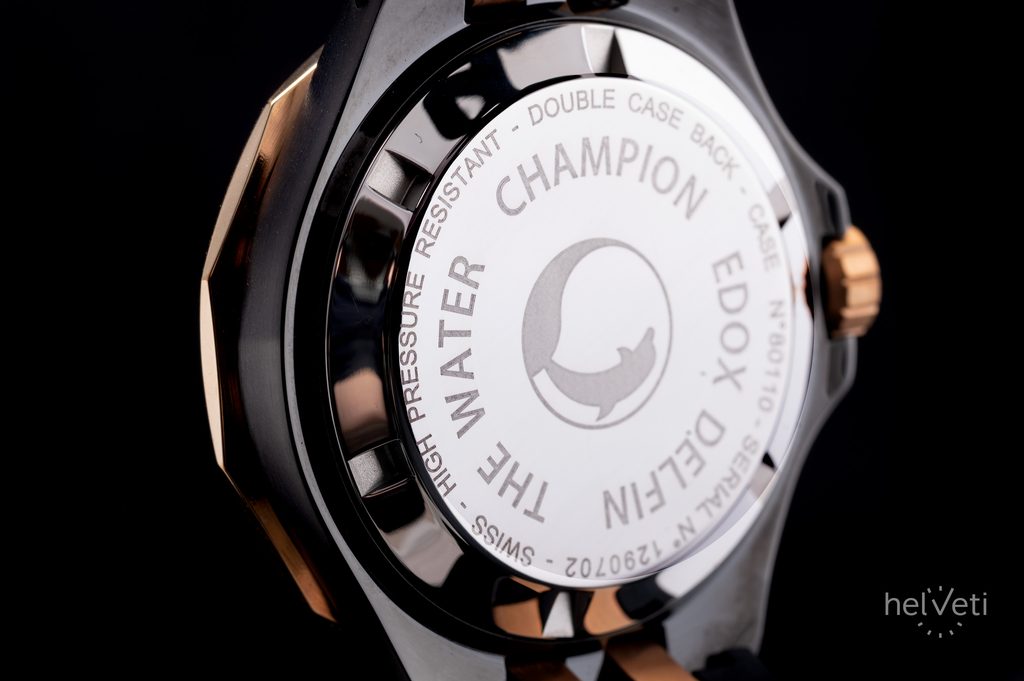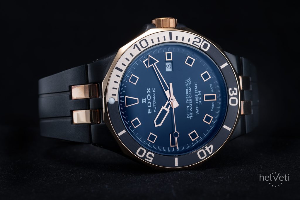 Model EDOX Delfin The Original Automatic 80110-357NRCA-NIR se vyznačuje typickým designem potápěčských hodinek, samozřejmostí je tedy výborná čitelnost, luminiscence a jednosměrně otočná luneta. Voděodolnost 300 m zaručuje odolnost při jakémkoli styku s vodou, včetně potápění a je podpořena šroubovací korunkou.