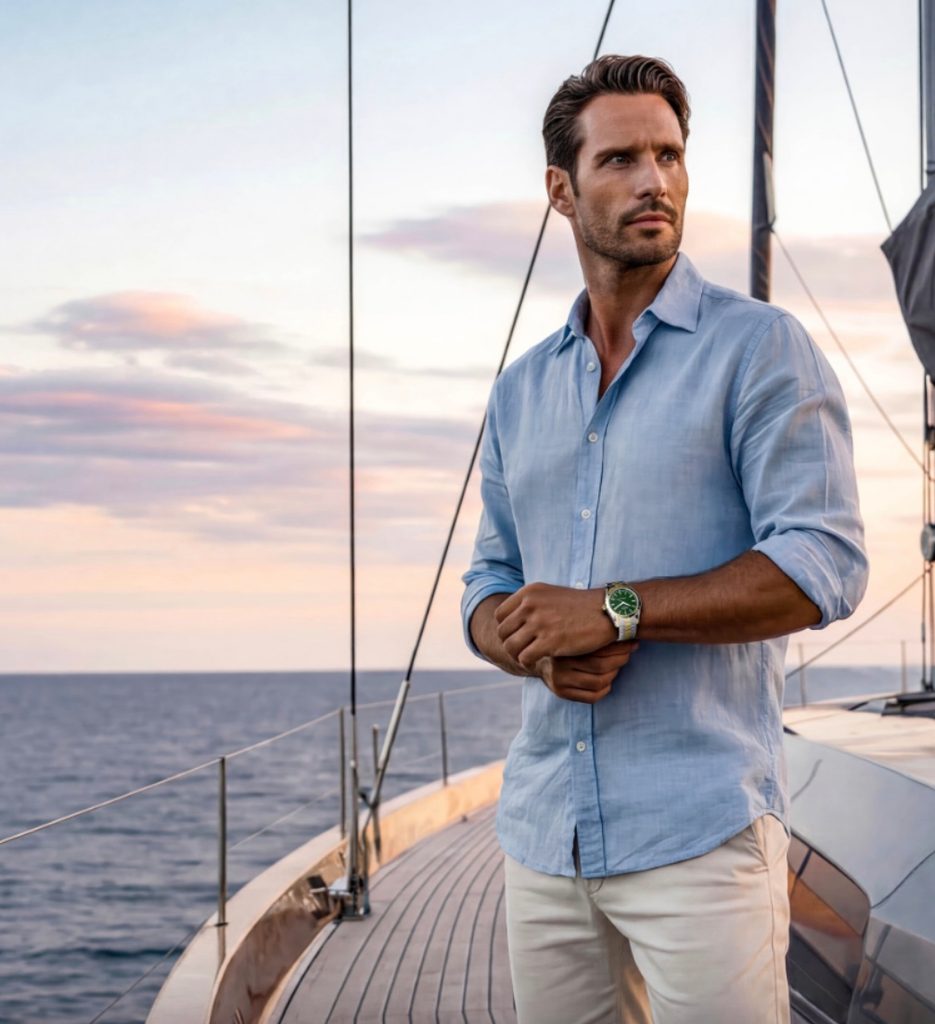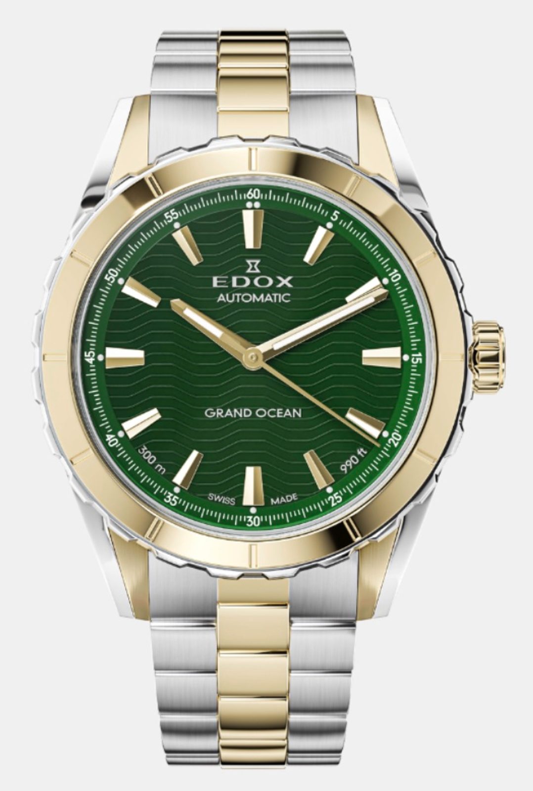 Ručky a indexy jsou v barvě růžového zlata, krásně tak kontrastují se zeleným číselníkem, na kterém jsou detaily vln, symbolizující propojení této modelové řady s oceány, moři a jachtingem. Luminiscenční jsou jak ručky tak i malé body umístěné mezi indexy a vnejší stupnicí číselníku.