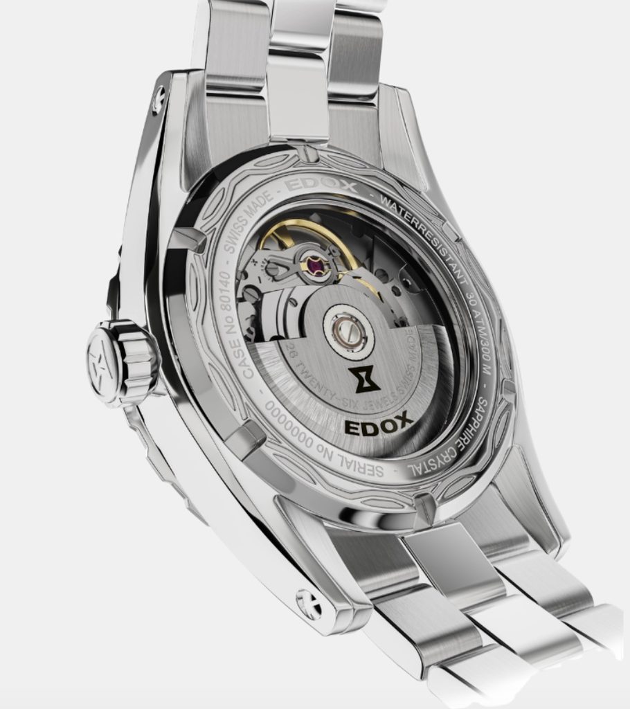 Výška pouzdra je 11,2 mm a váha hodinek činí 155 g. U náramku je bezpečnostní překlápěcí spona s logem Edox.