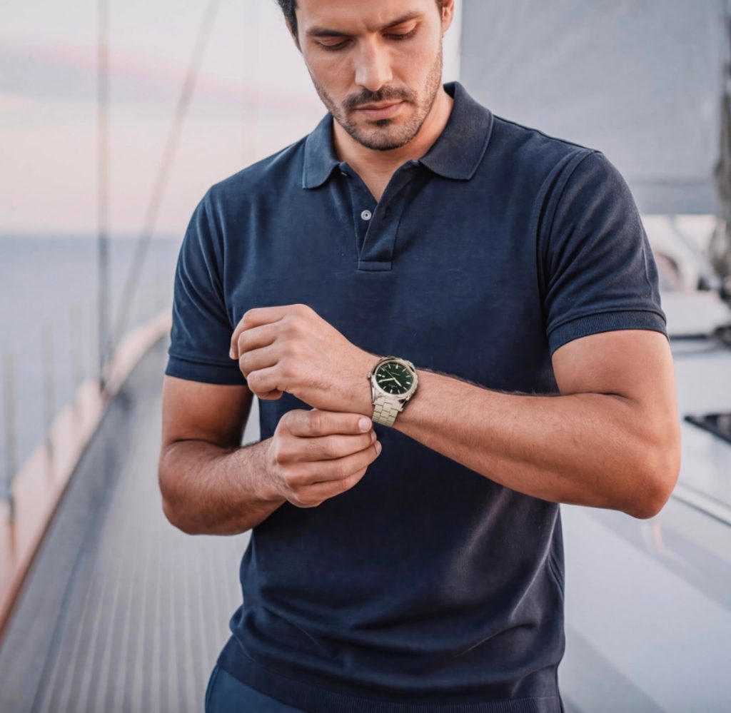 Ručky a indexy jsou ve zlaté barvě, krásně tak ladí se zeleným číselníkem, na kterém jsou detaily vln, symbolizující propojení této modelové řady s oceány, moři a jachtingem. Luminiscenční jsou jak ručky tak i malé body umístěné mezi indexy a vnejší stupnicí číselníku.