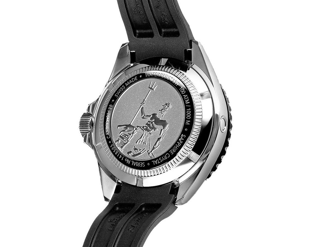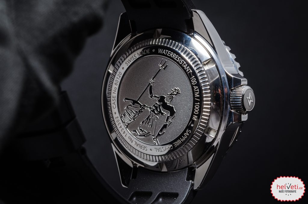 Na dýnku hodinek je vyobrazen bůh moře Neptun s jeho ikonickým trojzubcem.