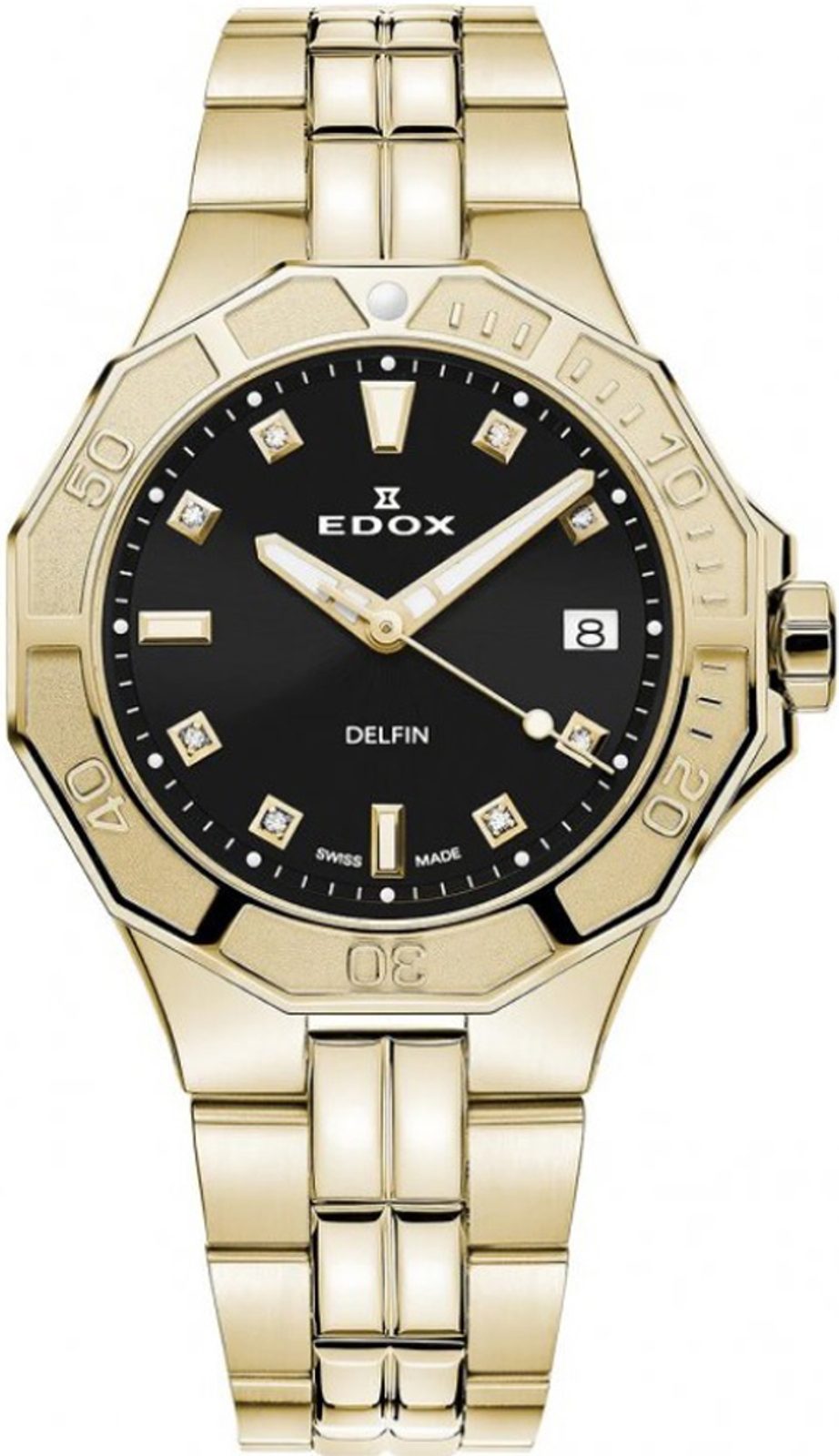 Hodinky EDOX Sport Delfin Diver Date Lady 53020-37JM-NID pohání švýcarský quartzový strojek Ronda 515 s funkcí hacking, kdy se při nastavování času zastaví vteřinová ručička. Hodinky disponují ukazatelem data na tradiční pozici 3. hodiny. Výrazným prvkem hodinek je ikonická 12ti hranatá otočná luneta a černý číselník, který je chráněn safírovým sklíčkem.