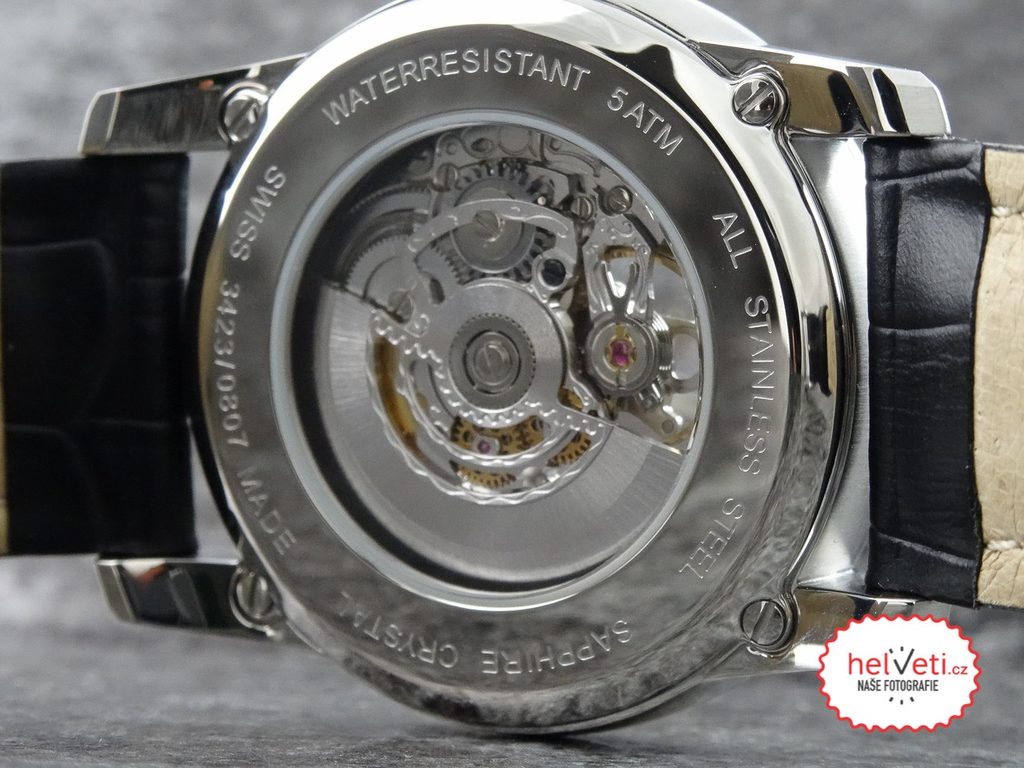 Elegantní pánské hodinky Epos Sophistique 3423.135.20.18.25 zaujmou na první pohled průhledným ciferníkem, skrz který můžete sledovat precizně zpracovaný automatický strojek ETA 2824.