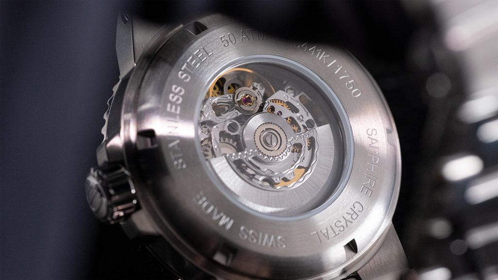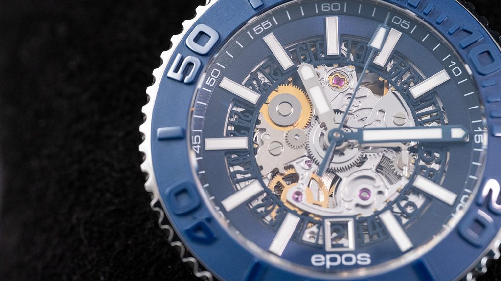 Model Epos Sportive 3441.135.26.16.30 je osazen švýcarským automatickým strojem Sellita SW200, jehož skeletonovou úpravu lze pozorovat díky průhlednému číselníku. Strojek disponuje tzv. funkcí hacking, kdy se při nastavování času zastaví vteřinová ručka, na pozici 6 pak najdeme ukazatel data. Samozřejmostí je antireflexní safírové sklo, které je maximálně odolné vůči poškrábání.