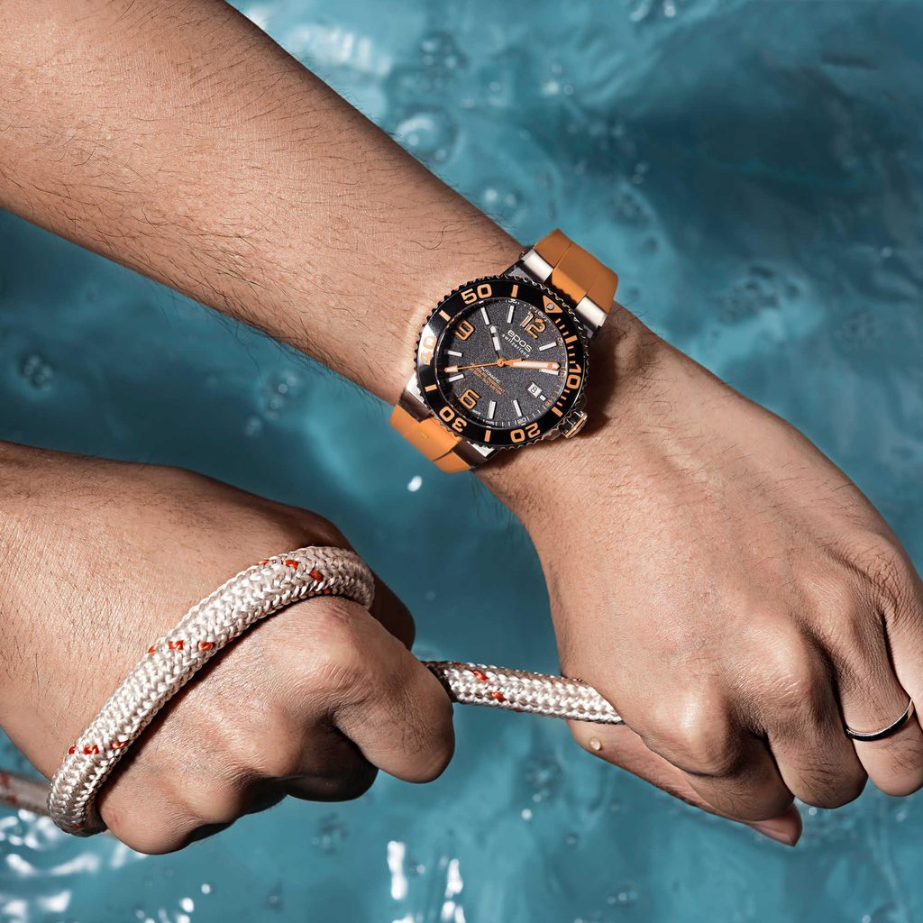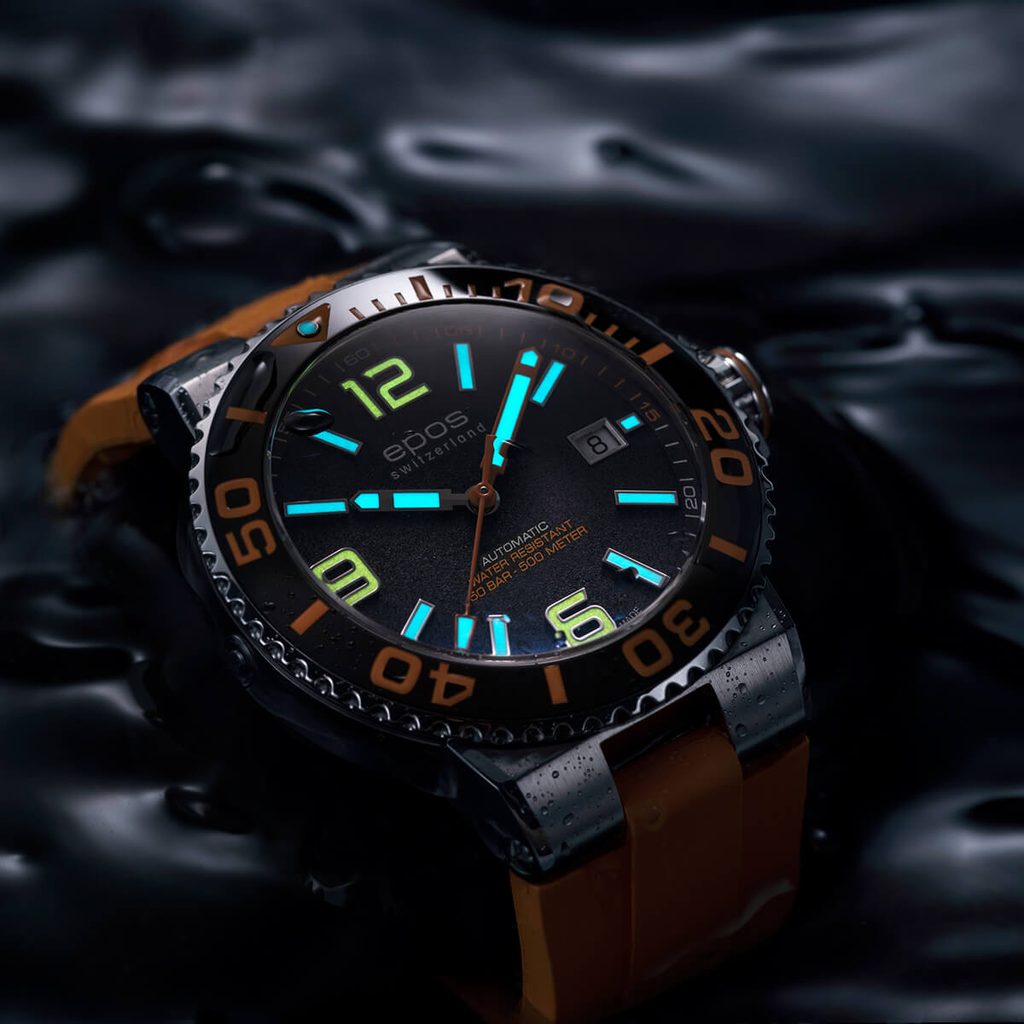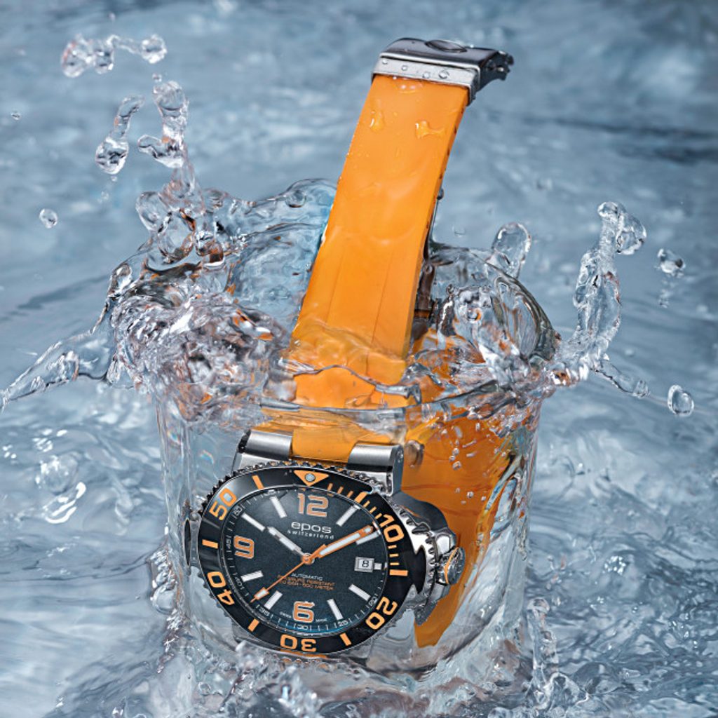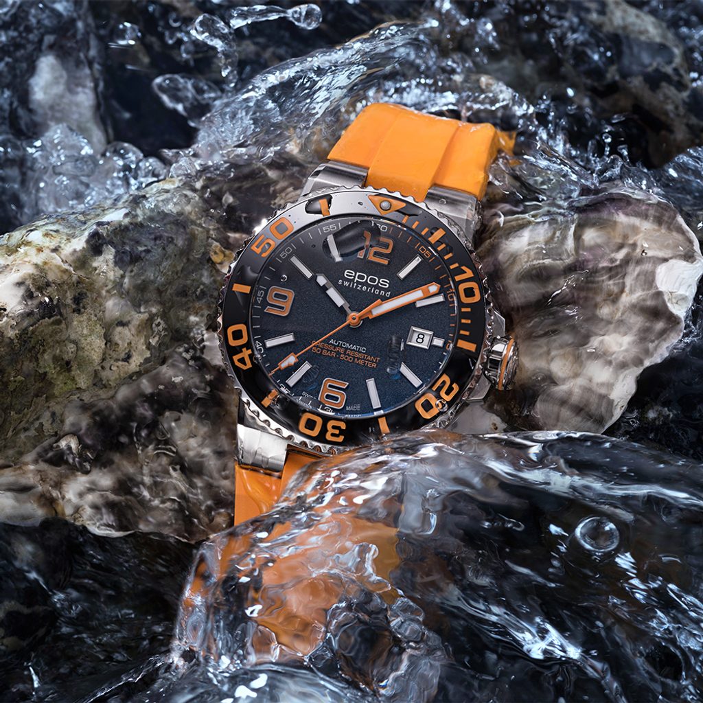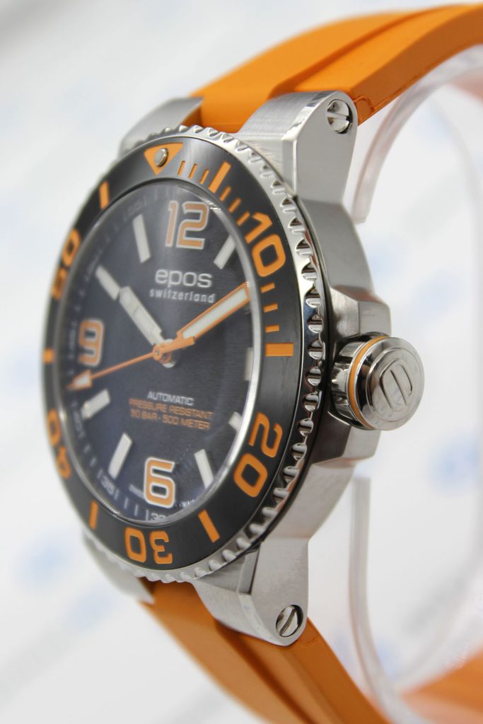 Pánské hodinky Epos Sportive 3441.131.99.52.52 jsou vyvedeny v oblíbeném potápěčském stylu. Černý číselník doplňují atraktivní oranžové detaily. O pohon se stará automatický strojek ETA 2824.