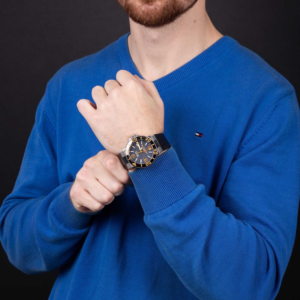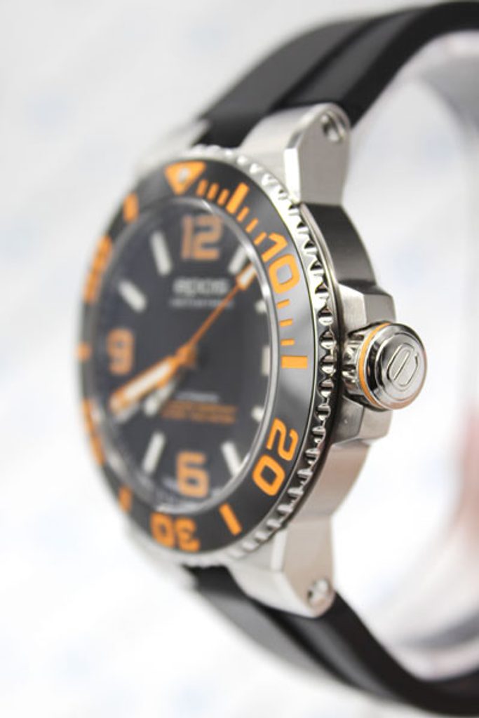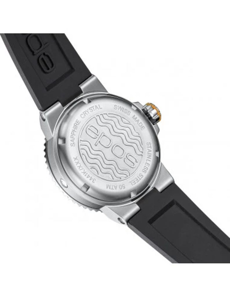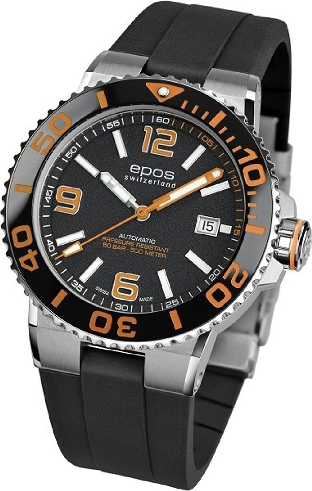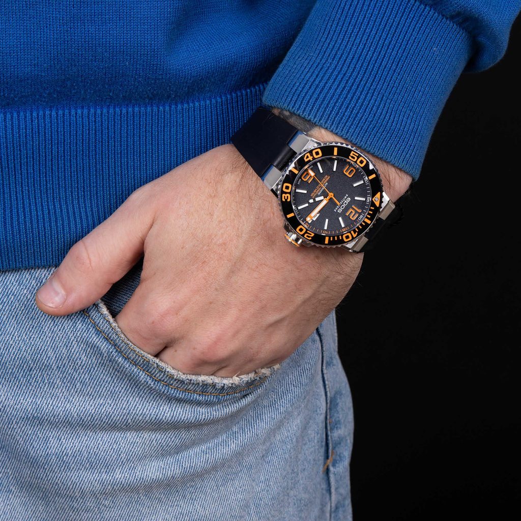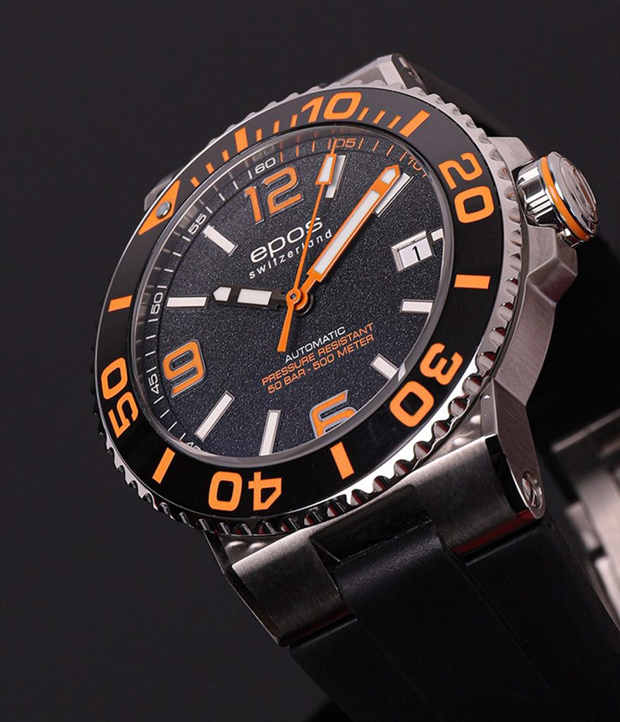 Pánské hodinky Epos Sportive 3441.131.99.52.55 jsou vyvedeny v oblíbeném potápěčském stylu. Černý číselník doplňují atraktivní oranžové detaily. O pohon se stará automatický strojek ETA 2824.