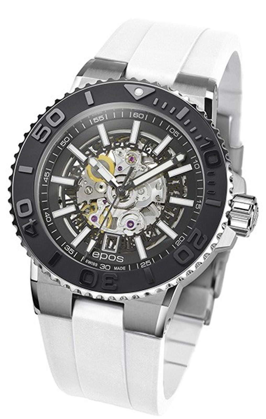 Pánské hodinky Epos Sportive 3441.135.25.15.50 jsou vyvedeny v oblíbeném potápěčském stylu. Tento model zaujme na první pohled průhledným číselníkem, skrz který můžete sledovat precizně zpracovaný skeletonovaný automatický strojek Sellita SW200.