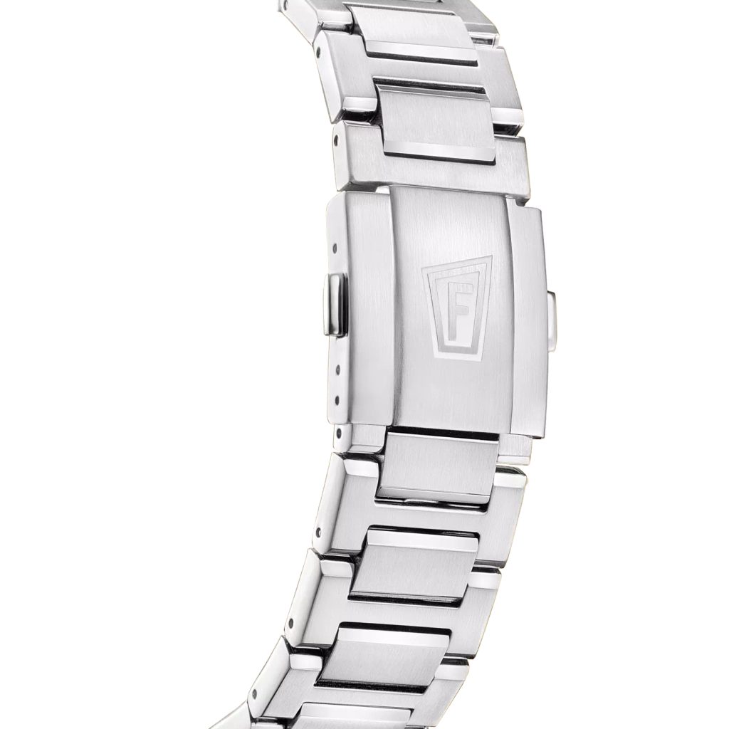 Pouzdro hodinek o průměru 45,5 mm je vyrobeno z nerezové oceli 316L, která mu zajišťuje pevnost a odolnost, zatímco ocelový řemínek nabízí díky mikroregulaci a překlápěcí sponě pohodlné a flexibilní uchycení pro jakoukoli aktivitu. Uvnitř pouzdra se skrývá quartzový strojek Miyota M0S20 s přesností chodu ±20 sec za měsíc, který umožňuje přesné měření času.