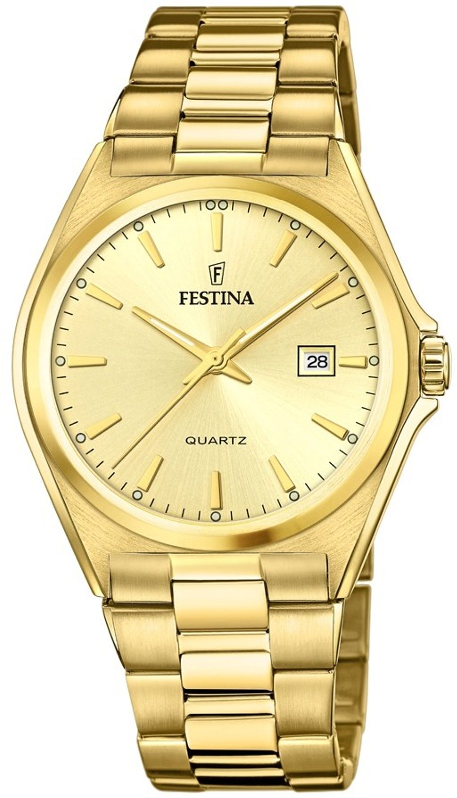 Pánské hodinky Festina 20555/3 jsou quartzové hodinky na ocelovém tahu s PVD úpravou zlaté barvy a zlatým číselníkem.
