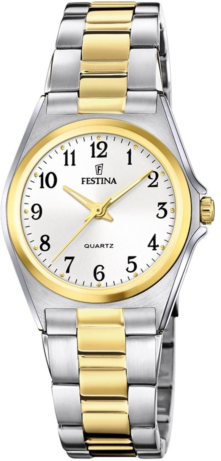 Dámské hodinky Festina 20556/1 jsou quartzové hodinky na ocelovém tahu s částečnou PVD úpravou zlaté barvy a se světlým číselníkem.
