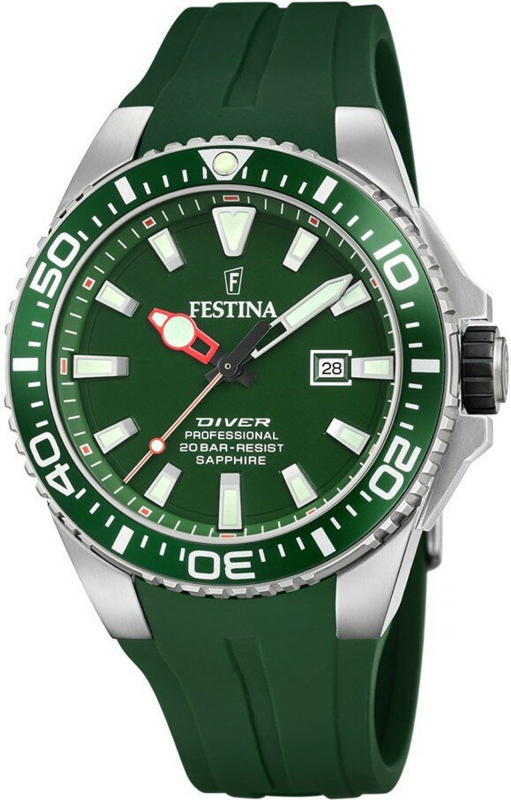 Hledáte doplněk hodný pravého gentlemana? Tím pravým jsou pánské hodinky Festina, kterými tato španělská značka vzdává hold tradičnímu hodinářství. Jejich zelený ciferník krytý safírovým sklíčkem zdobí luminiscenční ručičky a indexy, které zajišťují perfektní čitelnost času i za snížené viditelnosti. Na pozici 3 najdete ukazatele data. Pouzdro korunované výraznou lunetou je vyrobené z té nejkvalitnější ušlechtilé oceli. Rozhodně oceníte i voděodolnost až do 20 BAR, díky které si můžete s hodinkami zaplavat a jsou vhodné i pro potápění. Vniknutí vody zabraňuje šroubovací korunka.