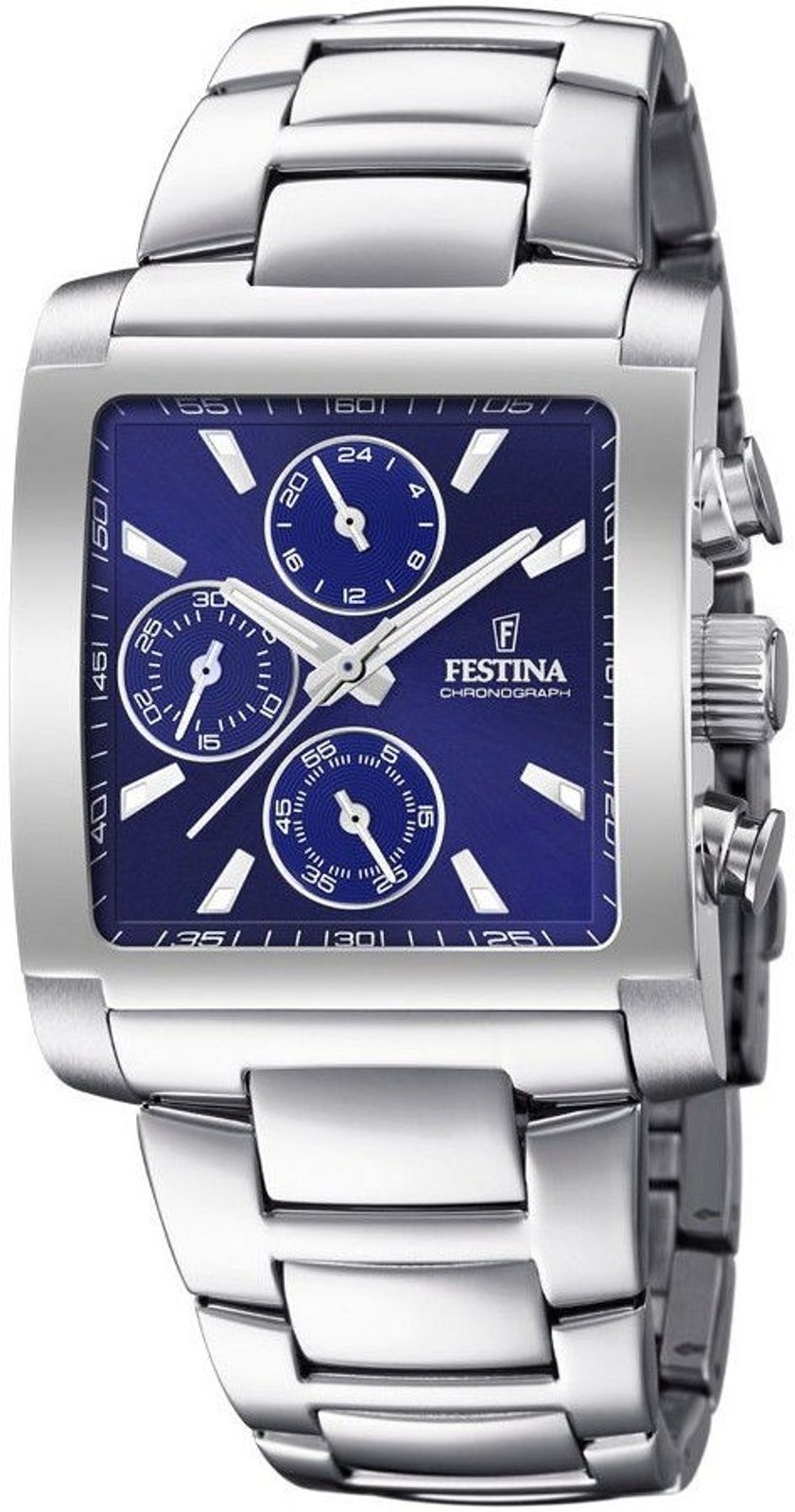 Hodinky Festina Timeless Chronograph 20264/2 jsou vyrobeny v celoocelovém provedení. Na netradičním čtvercovém ciferníku chráněném minerálním sklíčkem se nachází datumovka a stopky a 24-hodinový subciferník.
