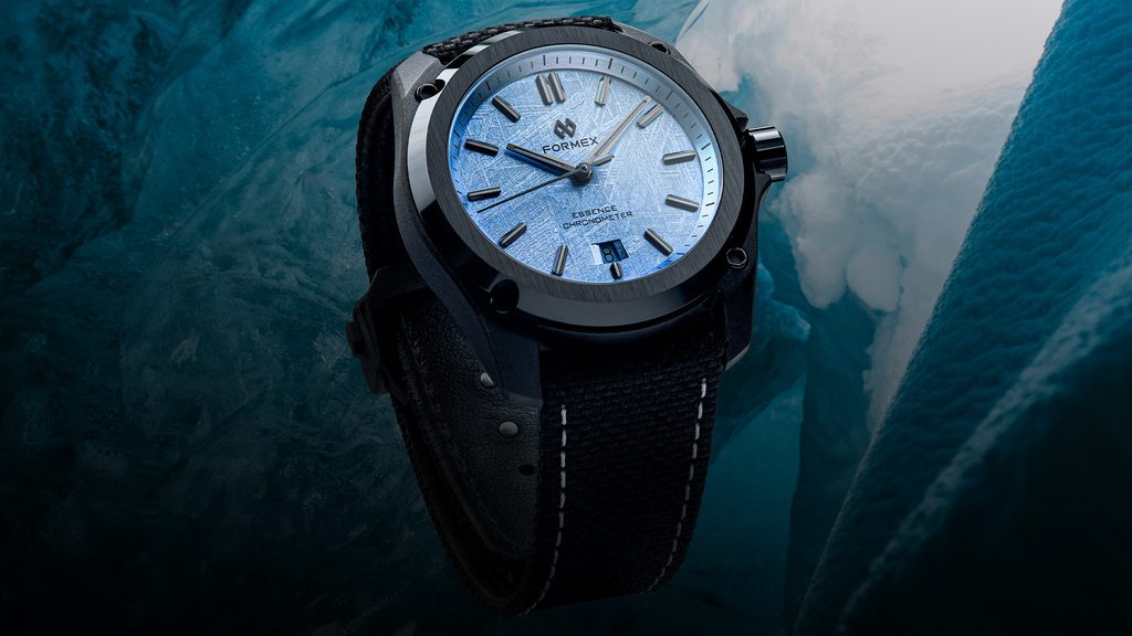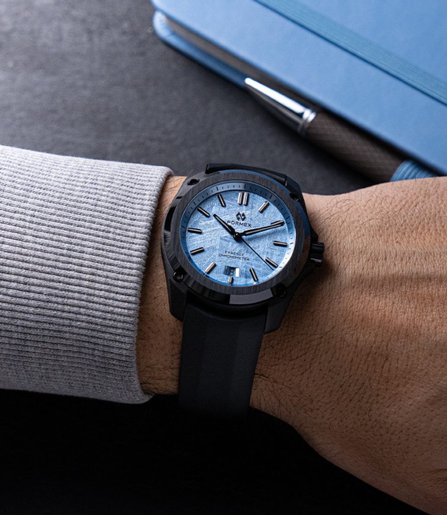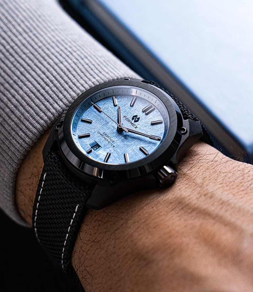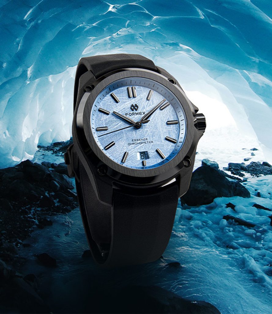 Formex Essence Leggera FortyOne Automatic Chronometer Space Glacier rozšiřují nabídku speciálních edicí, které dělá unikátními jejich číselník. V tomto případě číselník z meteoritu, který je postříbřený 98% stříbrem. Na meteorit je galvanickým pokovováním nanesena vrstva 98% stříbra, po níž následuje ruční nanášení šesti vrstev průhledného laku zapon teintée. Jedná se o jemný průhledný celulózový lak s kapkou modré barvy.