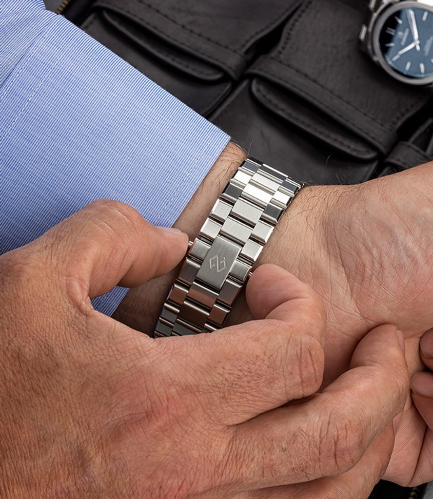 Hodinky je možné dodat v kombinaci s ocelovým náramkem zakončeným motýlovou sponou s možností prodloužení o 4 mm, anebo koženým/ pryžovým řemínkem zakončeným karbonovou překlápěcí sponou s inovativním systémem jemné mikroregulace v rozsahu 7 mm. Úpravu délky u ní snadno provedete stiskem bočního tlačítka bez potřeby sundání hodinek z ruky.
