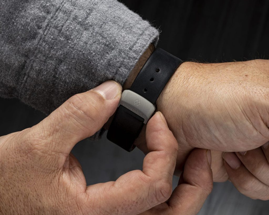 Pouzdro v základu doplňuje černý kožený řemínek, zakončený překlápěcí sponou s inovativním systémem jemné mikroregulace v rozsahu až 7 mm. Volitelně je možné dodávaný řemínek změnit.