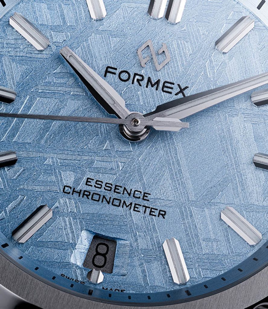 Formex Essence ThirtyNine Space Glacier rozšiřují nabídku speciálních edicí, které dělá unikátními jejich číselník. V tomto případě číselník z meteoritu, který je postříbřený 98% stříbrem. Na meteorit galvanickým pokovováním nanesena vrstva 98% stříbra, po níž následovalo ruční nanášení šesti vrstev průhledného laku zapon teintée. Jedná se o jemný průhledný celulózový lak s kapkou modré barvy.