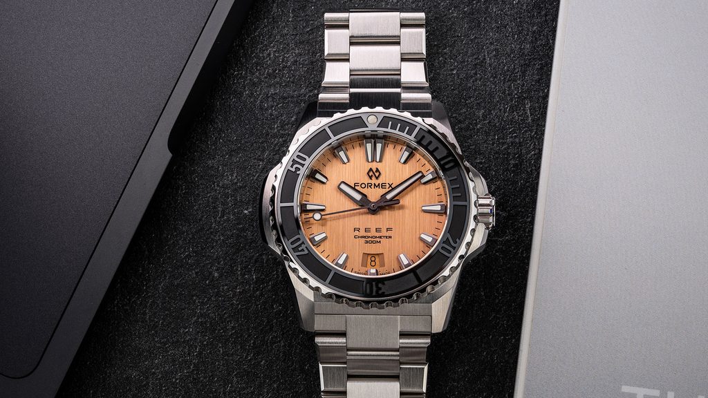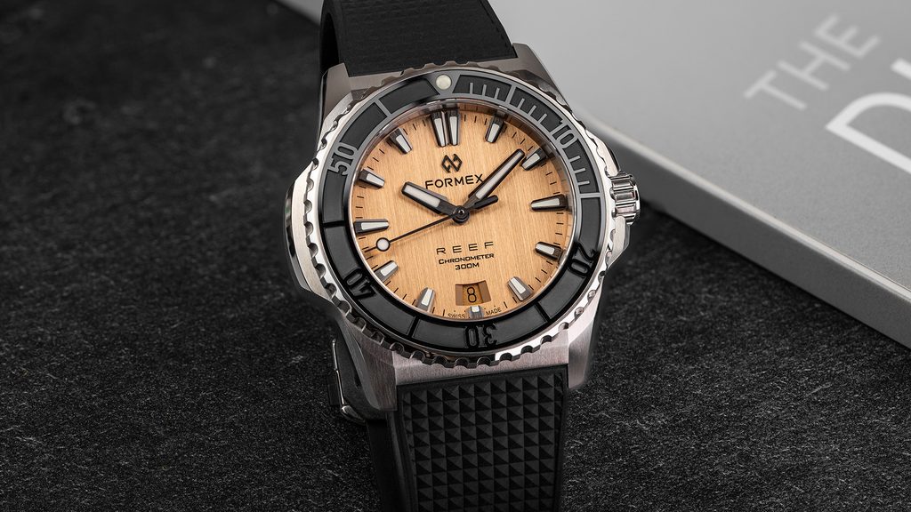 Švýcarské potápěčské hodinky Formex Reef 39,5 Automatic Chronometer Bronze Dial 2201.1.6382.100 na první pohled zaujmou výrazným bronzovým číselníkem a jasně rozpoznatelným pouzdrem. Jsou moderní podobou potápěčských hodinek vhodných pro jakoukoliv příležitost, které se vyznačují jednoduchými liniemi, vysokou odolností a skvělou přehledností.