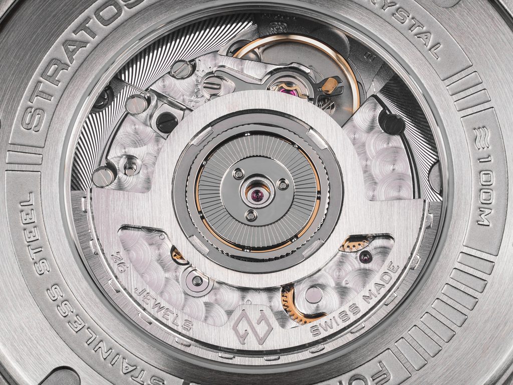 Formex Stratos UTC přichází s velmi intuitivní a pro ovládání praktickou true GMT. Pro pohon hodinek byl zvolen strojek ETA 2892 s Formexem speciálně upraveným modulem Dubois-Dépraz, díky němuž nemůže být úprava časového pásma snazší. Pouhým stiskem jednoho z tlačítek na boku pouzdra provedete posun hodinové ručky zobrazující místní čas vpřed anebo vzad o jednu hodinu, zatímco GMT ručka zůstává na místě. Datum vyvedené v subciferníku na pozici 6. hodiny reaguje na posun hodinové ručky a je schopné se spolu s ní upravovat vpřed i vzad. Vedle toho pro rychlé nastavení správného data najdeme na levém boku pouzdra korekční tlačítko. Pro změnu data tedy není třeba manipulovat se šroubovací korunkou. Poslední z funkcí je indikátor dne/noci místního času v úrovni 9. hodiny, který je praktickým pomocníkem při nastavování hodinek.