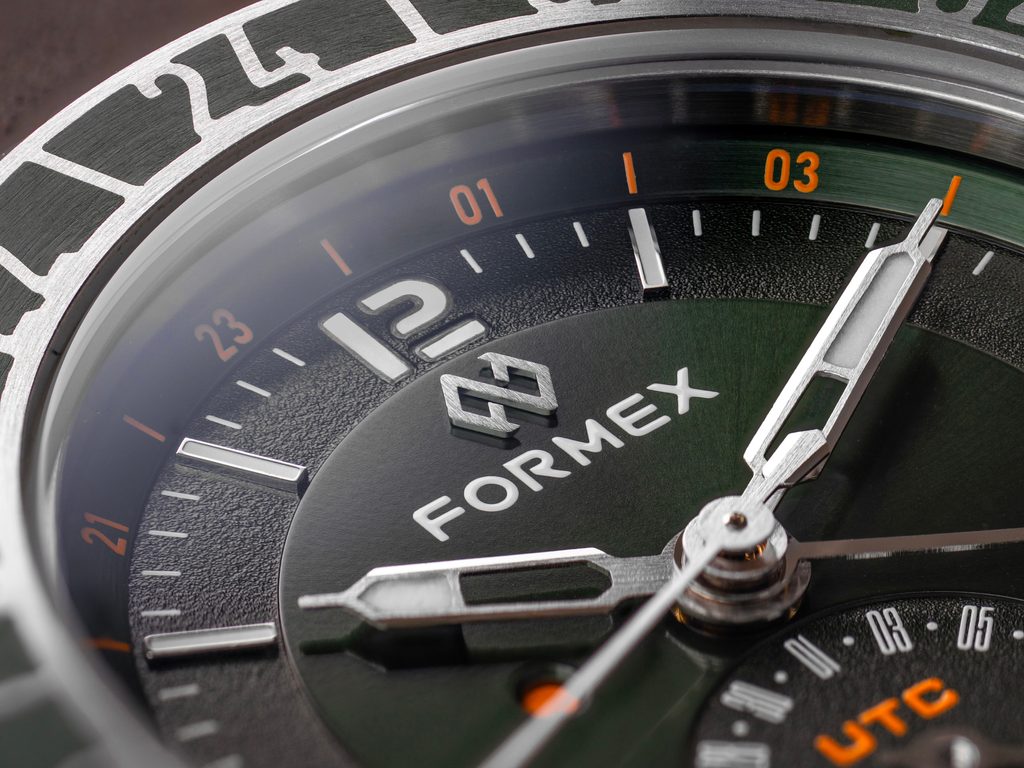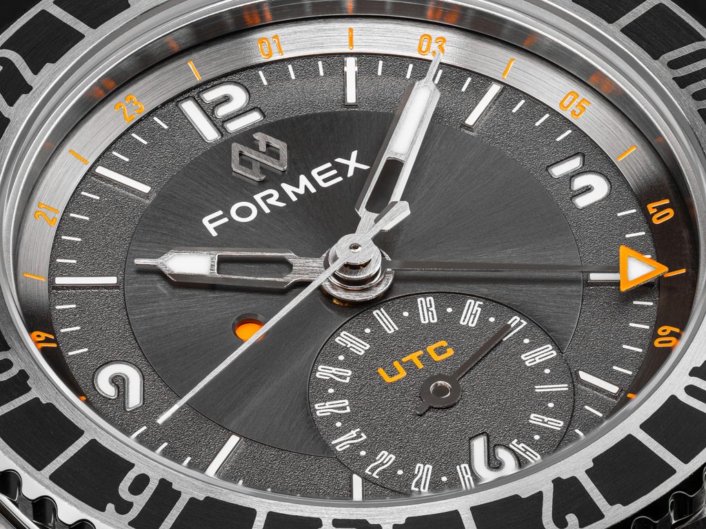 Číselník z dílny Formexu už tradičně potěší precizním zpracováním na velmi vysoké úrovni, jmenovat můžeme broušený střed s efektem slunečního brusu, obklopený okružím s hrubší strukturou a originálním fontem číslic. GMT ručka hodinek je dostatečně kontrastní pro výbornou přehlednost. Celkový dojem podtrhuje citlivě navržený ukazatel denní doby na pozici 9. hodiny a data na pozici 6. hodiny. U hodinek oceníte především jejich všestrannost, souborem svých vlastností jsou předurčené pro použití při sportu, ve vodě, ale také při cestování a jako každodenní doplněk.