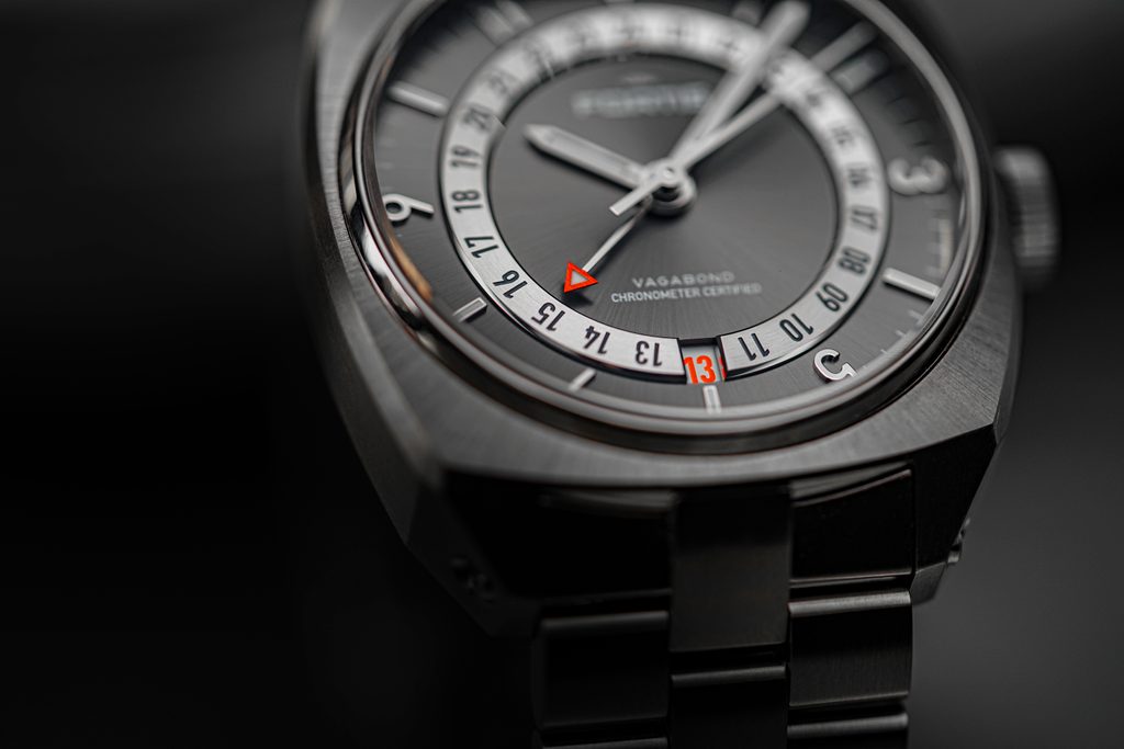 Hodinky Fortis Vagabond V-40 Urban Shadow COSC F6660004 mají pouzdro včetně náramku vyrobené z titanu Grade 5 Titanium, který je odolnější vůči poškrábání. Jemnou regulaci délky náramku bez použití nástrojů umožňuje posuvný mechanismus na sponě. V pouzdře spolehlivě pracuje švýcarský mechanický manufakturní strojek Fortis WERK 13 (vyrobený pro Fortis společností Kenissi) s automatickým nátahem. Ten běží na frekvenci 28800 polokmitů za hodinu disponuje 28 kameny a především prodlouženou rezervou chodu 70 hodin. Strojek má také funkci "hacking" (zastavení sekundové ručky při nařízení) a možnost manuálního nátahu korunkou. Především cestovatelé ocení funkci GMT - tedy ukazatel druhé časové zóny formou čtvrté ručky. Navíc se jedná o tzv. True GMT, kdy se s nastavením času pohybuje i GMT ručka a nastavení hlavní hodinové ručky pak probíhá skokově po jedné hodině, přičemž domácí čas na GMT ručce zůstává nezměněn. Zajímavostí je GMT disk na číselníku, vyrobený z 18 karátového bílého zlata. Ten kromě toho, že na něm lze odečítat domovské časové pásmo, symbolizuje odolnost, luxus, ale především vzácnost domova. Na pozici 6.hodiny najdeme praktický ukazatel data.