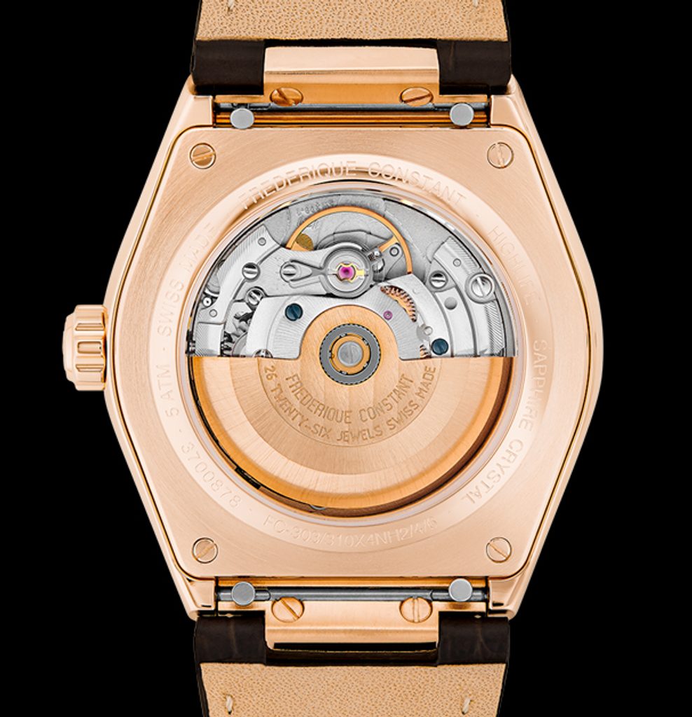 Pouzdro hodinek Frederique Constant FC-303B4NH4 je vyrobeno z ušlechtilé oceli s PVD úpravou v barvě růžového zlata a je doplněno koženým řemínkem. Součástí balení je také pryžový řemínek navíc. Tah i řemínek disponují rychlostěžejkami a lze je tedy snadno a rychle měnit bez použití nástrojů. Uvnitř pouzdra spolehlivě pracuje švýcarský mechanický strojek FC-303 (základem je Sellita SW200) s automatickým nátahem. Ten pracuje na frekvenci 28800 polokmitů za hodinu a disponuje 26 kameny. Strojek disponuje certifikací COSC. Díky tomu může nést označení "Chronometer" a splňuje nejpřísnější požadavky na přesnost chodu. Činnost strojku lze pozorovat průhledným dýnkem. Na tradiční pozici třetí hodiny najdeme praktický ukazatel data.