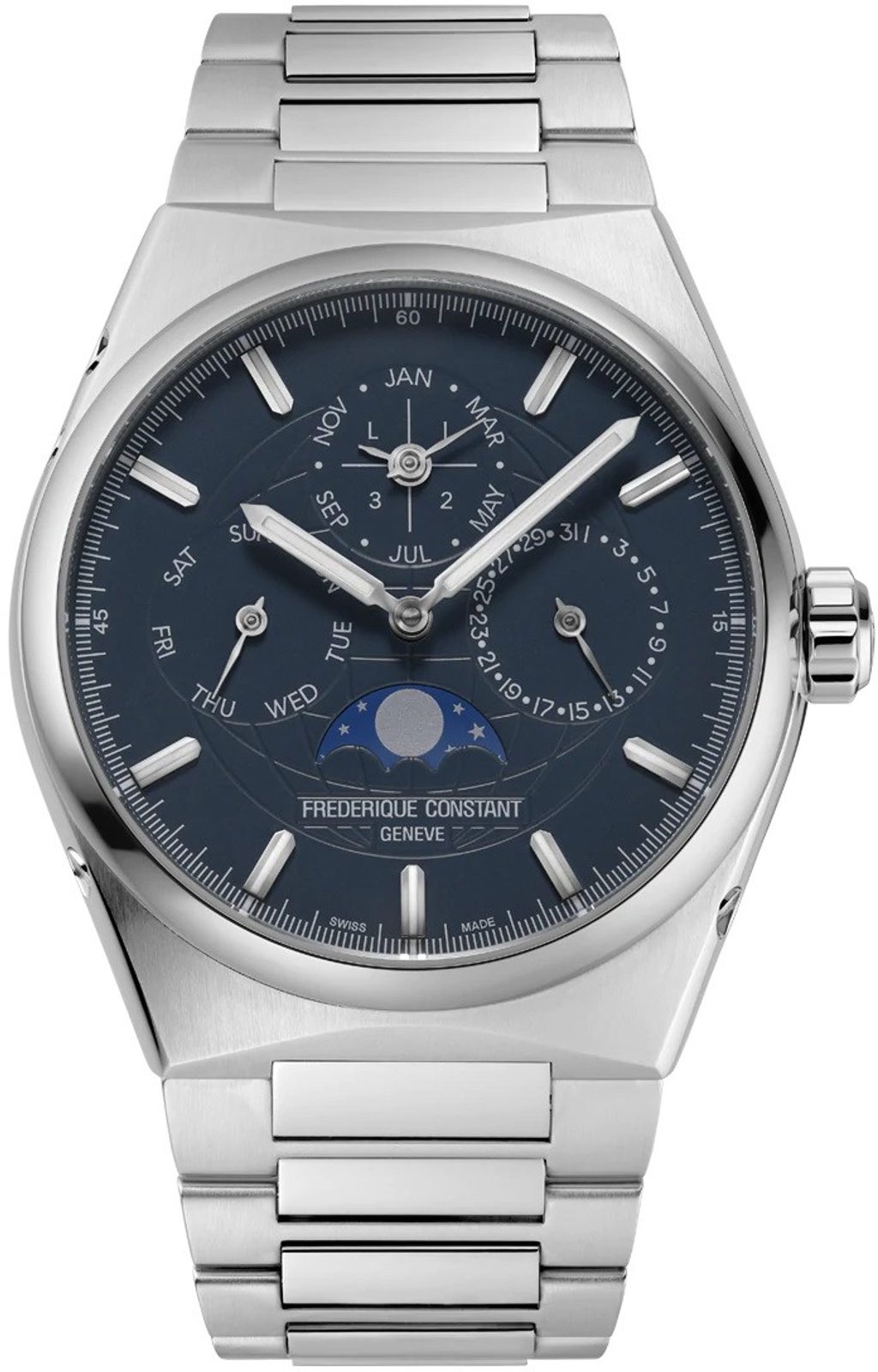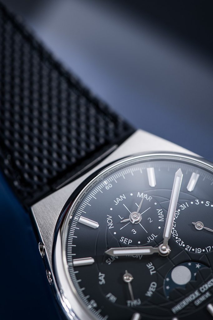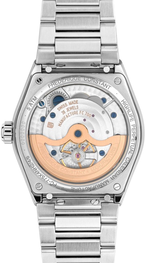 Pouzdro hodinek Frederique Constant FC-775BL4NH6B je vyrobeno z ušlechtilé oceli, stejně jako jejich náramek. Součástí balení je také pryžový řemínek navíc. Tah i řemínek disponují rychlostěžejkami a lze je tedy snadno a rychle měnit bez použití nástrojů. Uvnitř pouzdra spolehlivě pracuje švýcarský mechanický in-house strojek FC-775 s automatickým nátahem. Ten pracuje na frekvenci 28800 polokmitů za hodinu a disponuje 25 kameny. Především však disponuje funkcí Perpetual Calendar, neboli věčný kalendář. Tato hodinářská komplikace se řadí mezi královské, tedy nejsložitější funkce ve světě hodinařiny. Znamená to, že tento kalendář po nastavení zobrazuje vždy přesné datum, den v týdnu a měsíc, zohledňující délku měsíců i přestupné roky a to bez nutnosti korekce až do roku 2100. K dispozici je také ukazatel přestupného roku a ukazatel měsíční fáze. Tento nádherně zdobený strojek lze pozorovat díky průhlednému dýnku.