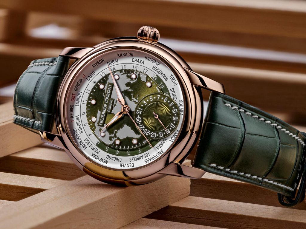 Pouzdro hodinek Frederique Constant FC-718KWWM4H9 je vyrobeno z 18 karátového růžového zlata a je doplněno řemínkem z aligátoří kůže. Uvnitř pouzdra spolehlivě pracuje švýcarský mechanický in-house strojek FC-718 s automatickým nátahem. Ten pracuje na frekvenci 28800 polokmitů za hodinu a disponuje 26 kameny. Strojek disponuje funkcí Worldtimer, kterou ocení hlavně cestovatelé. Díky ní lze odečítat čas napříč časovými pásmy pomocí otočného disku ve formátu 24 hodin. Nechybí ani indikace dne a noci. Tento nádherně zdobený strojek lze pozorovat díky průhlednému dýnku. Na pozici šesté hodiny najdeme netradičně řešený ukazatel data ve formě subčíselníku s ručkou.