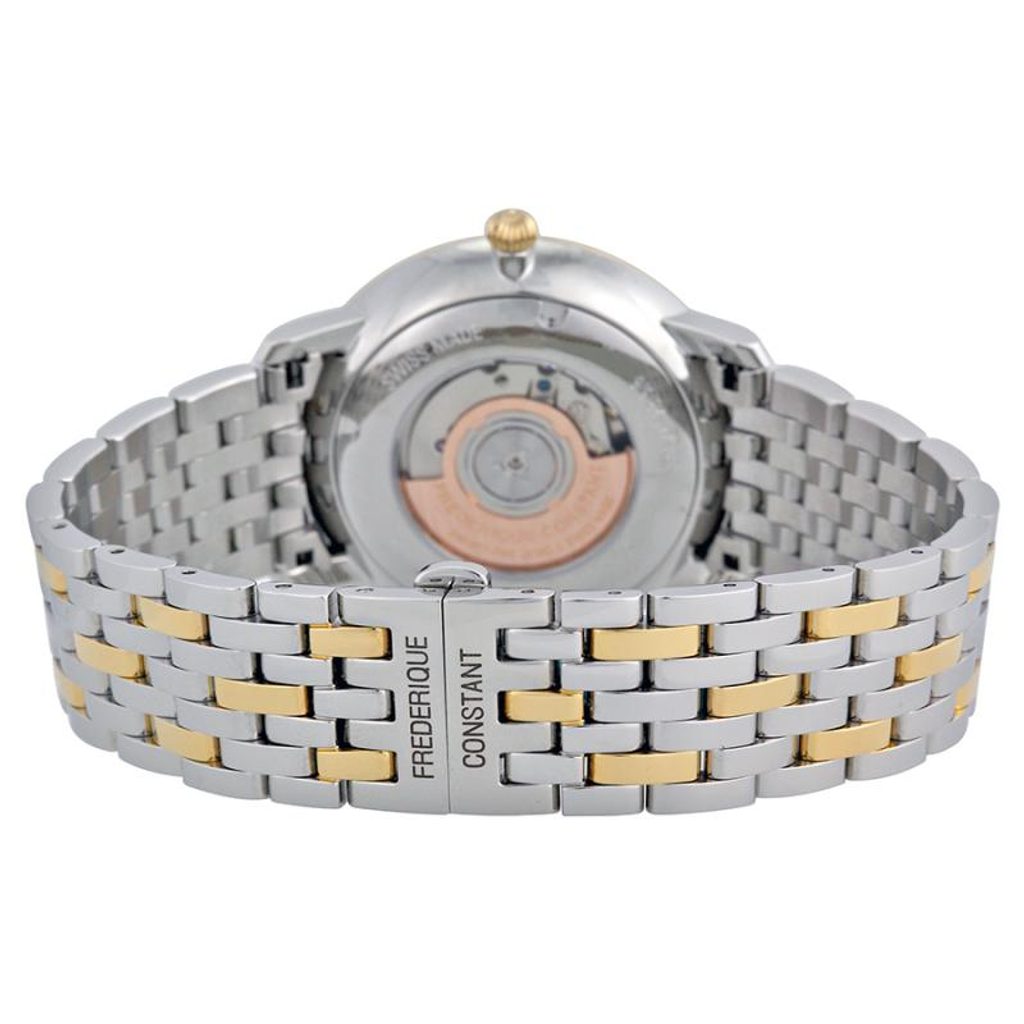Pouzdro hodinek Frederique Constant FC-306V4S3B2 je vyrobeno z ušlechtilé oceli s částečnou PVD úpravou zlaté barvy, stejně jako jejich náramek. Uvnitř pouzdra spolehlivě pracuje švýcarský mechanický strojek FC-306 (základem je Sellita SW300) s automatickým nátahem. Ten pracuje na frekvenci 28800 polokmitů za hodinu a disponuje 25 kameny. Činnost strojku lze pozorovat průhledným dýnkem. Na tradiční pozici třetí hodiny najdeme praktický ukazatel data.