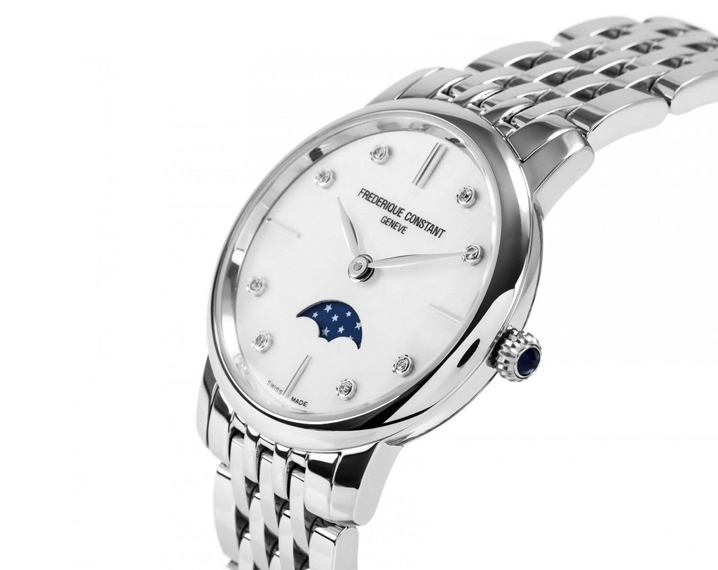 Dámské hodinky Frederique Constant Slimline Ladies Moonphase Quartz FC-206MPWD1S6B spadají do řady Slimline a díky svému elegantnímu vzhledu jsou vhodné jako doplněk do společnosti. Výborně však poslouží i pro každodenní nošení. Řada Slimline je mimořádně pohodlná díky velmi nízké výšce pouzder.