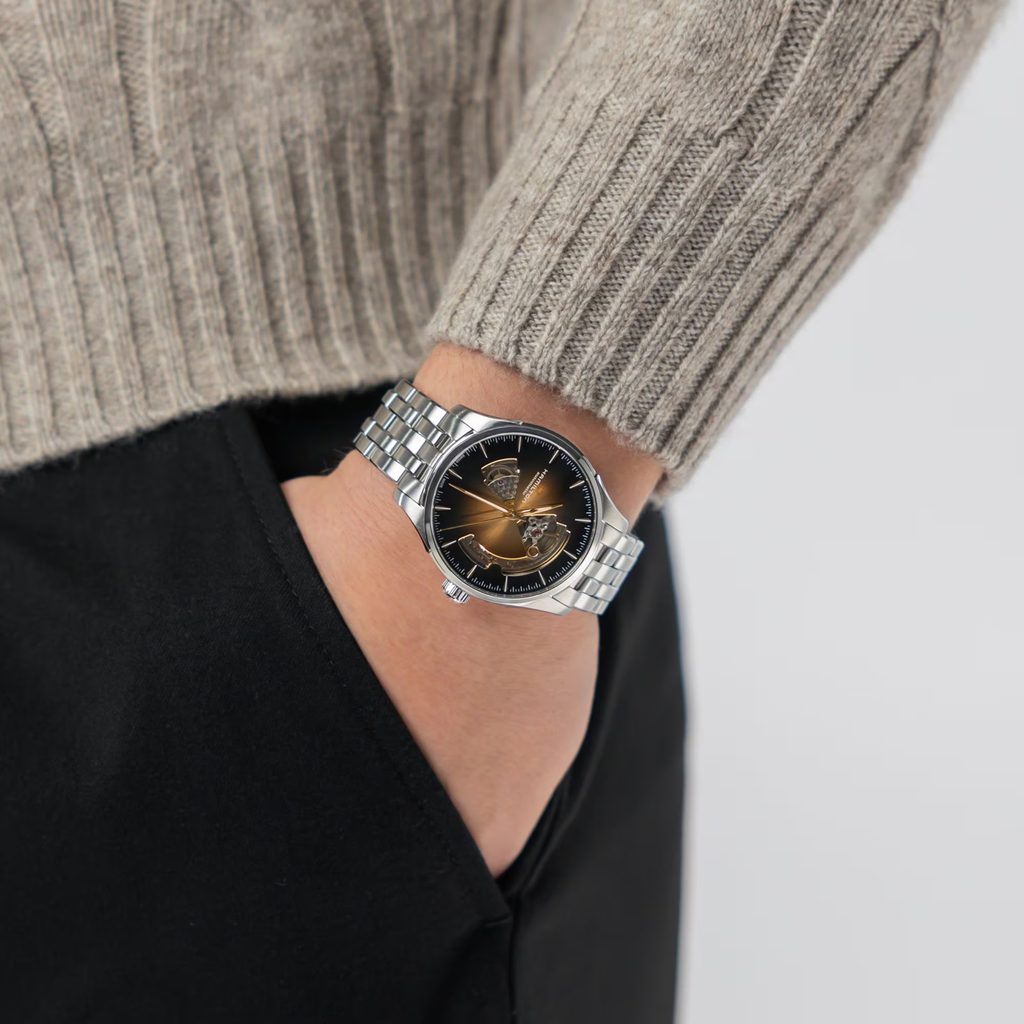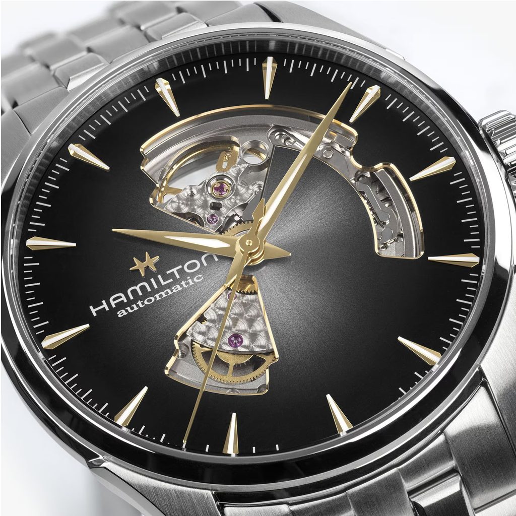 Jazzmaster Open Heart nabízí letmý pohled na svou výkonnou práci strojku a nechává ve středu pozornosti přesnost. Tyto úžasné hodinky s podmanivým černým ciferníkem, který se třpytí, spojuje modernost městské architektury s nekonečností vesmíru. Číselník předvádí neustále se vyvíjející řemeslnou zručnost a pozornost k detailu značky Hamilton a přináší automatický strojek H-10 do centra pozornosti. S rezervou chodu 80 hodin a balanční pružinou Nivacron™ je Jazzmaster Open Heart Auto vybaven složitým náramkem z nerezové oceli. Objevte kolekci společenských hodinek Hamilton.