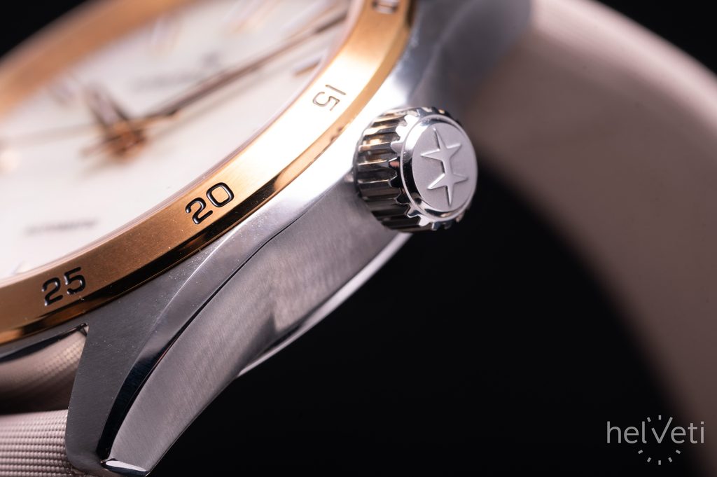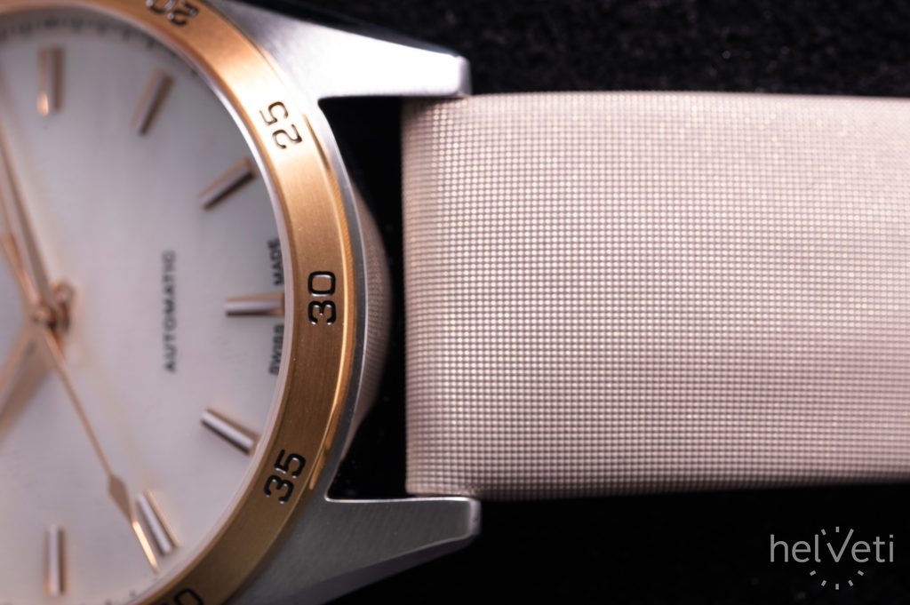 Elegantní a zároveň přehledný světle růžový číselník je chráněn safírovým sklíčkem, které je maximálně odolné vůči poškrábání. Antireflexní vrstva zaručuje skvělou čitelnost i na ostrém slunci.