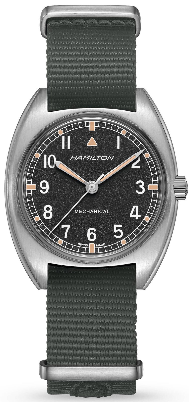 Model Hamilton Khaki Aviation Pilot Pioneer Mechanical H76419931 je reinterpretací historických vojenských hodinek vyrobených pro britské královské letectvo v roce 1973. Díky výraznému vzoru ciferníku a robustnímu řemínku NATO jsou tyto hodinky vojenské hodinky se skutečným charakterem.