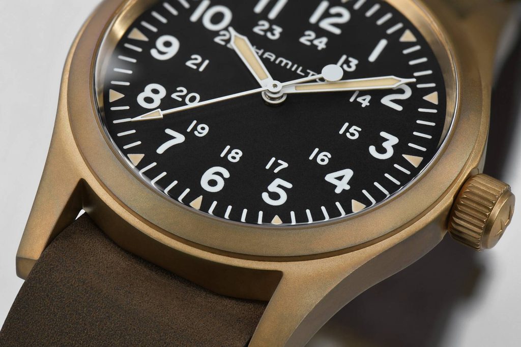 *Každé pouzdro Khaki Field Mechanical Bronze si vyvine svou vlastní individuální patinu na základě vlivu vnějšího prostředí. Nechte na svých hodinkám vytvořit patinu pro jedinečný vzhled. K čištění hodinek můžete použít hadřík z mikrovlákna.