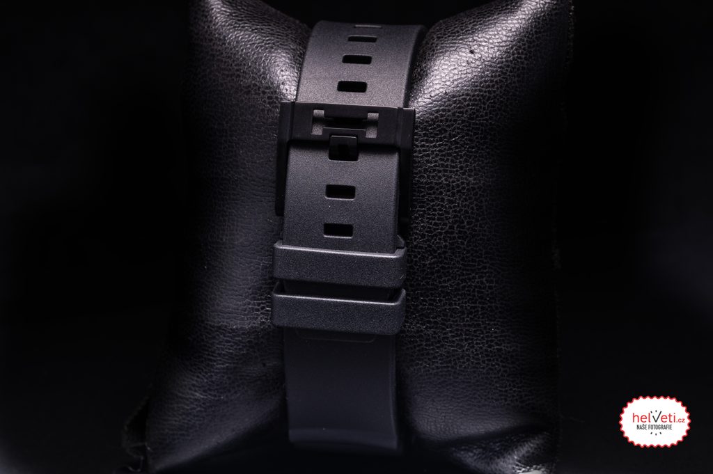 Na ocelové pouzdro hodinek s PVD povrchovou úpravou v černé barvě navazuje kvalitně zpracovaný kaučukový řemínek černé barvy s trnovou sponou.