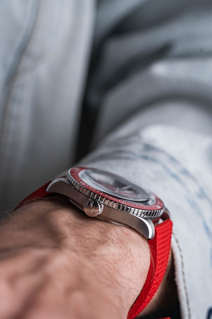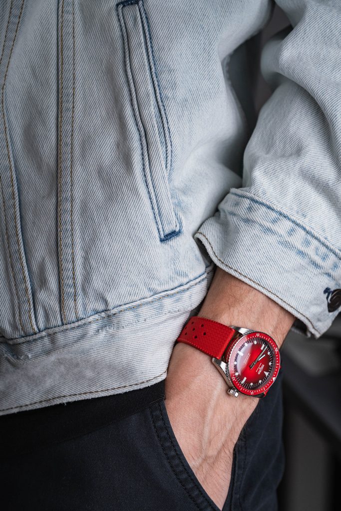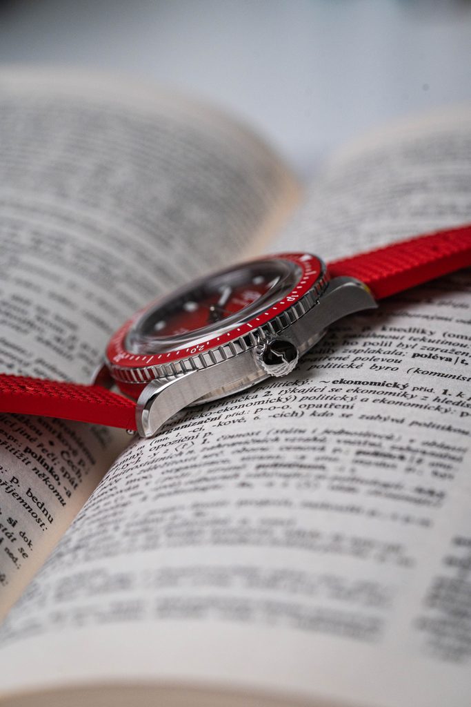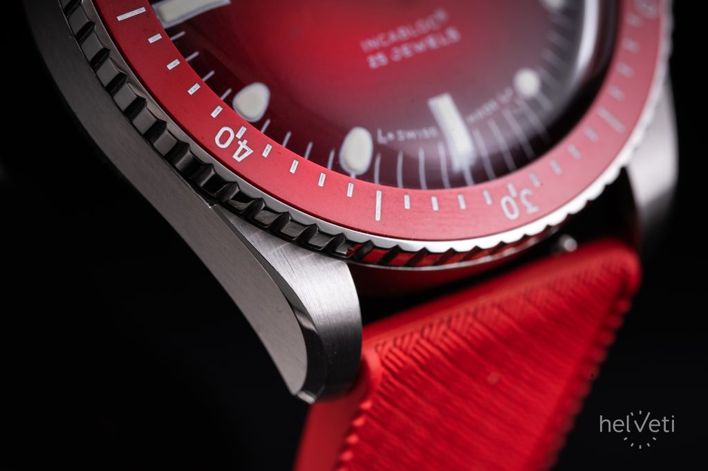 Dokonale přehledný číselník je vyveden v atraktivní "Helveti" červené barvě a celý design vhodně doplňuje červená jednosměrně otočná potápěčská luneta, jejíž vložka je keramická. To má za následek její vysokou odolnost proti poškrábání. Číselník je chráněn vypouklým safírovým sklíčkem, které je maximálně odolné proti poškrábání. Vnitřní antireflexní vrstva pak zajišťuje skvělou čitelnost i na ostrém světle. Hodinky mají voděodolnost 200m (20 ATM), zvládnou tedy i plavání, nebo ponor do cca 20 metrů. Voděodolnost je podpořena šroubovací korunkou.