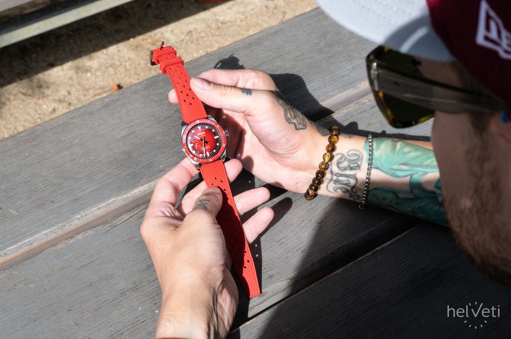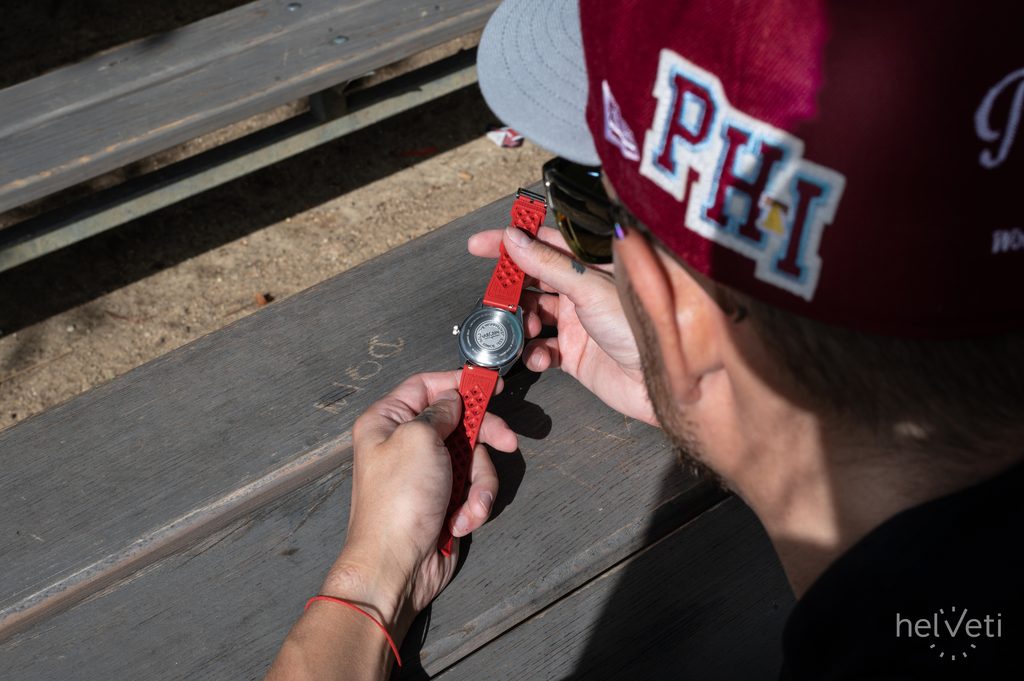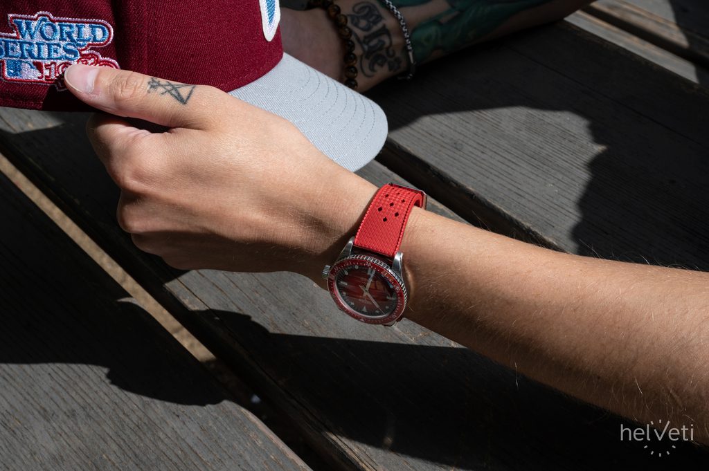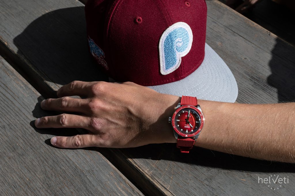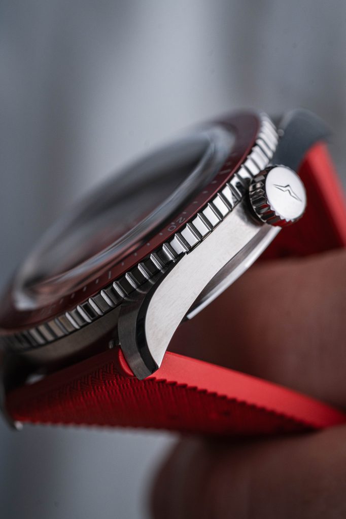 Dokonale přehledný číselník je vyveden v atraktivní "Helveti" červené barvě a celý design vhodně doplňuje červená jednosměrně otočná potápěčská luneta, jejíž vložka je keramická. To má za následek její vysokou odolnost proti poškrábání. Číselník je chráněn vypouklým safírovým sklíčkem, které je maximálně odolné proti poškrábání. Vnitřní antireflexní vrstva pak zajišťuje skvělou čitelnost i na ostrém světle. Hodinky mají voděodolnost 200m (20 ATM), zvládnou tedy i plavání, nebo ponor do cca 20 metrů. Voděodolnost je podpořena šroubovací korunkou.