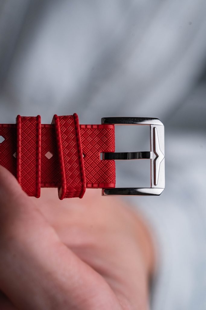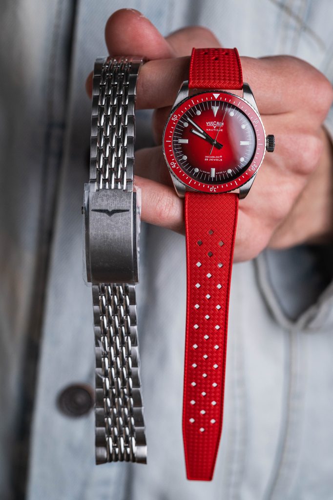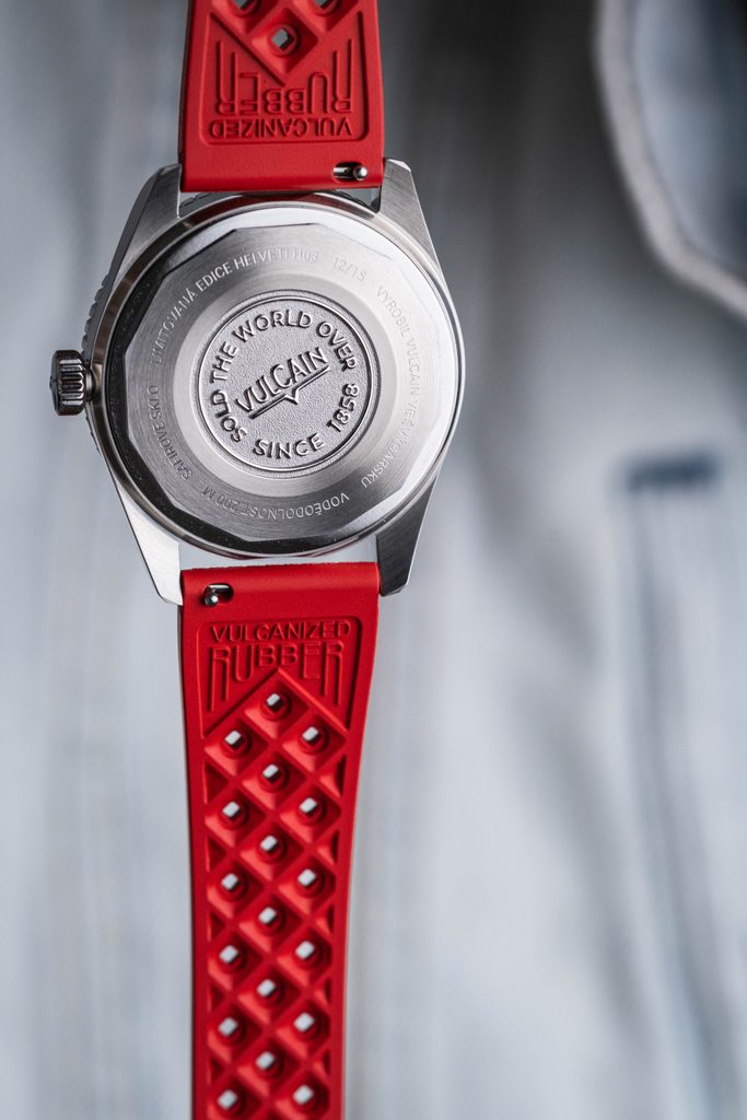 Hodinky Helveti x Vulcain H03 mají pouzdro vyrobené z ušlechtilé oceli a na ruce drží díky červenému pryžovému řemínku. Součástí balení je také ocelový "Beads of Rice" náramek navíc. Uvnitř pouzdra spolehlivě pracuje lety prověřený švýcarský strojek ETA 2824 s automatickým nátahem. Skrývá v sobě 25 kamenných uložení a jeho setrvačka pracuje na moderní frekvenci 28800 polokmitů za hodinu (4Hz).