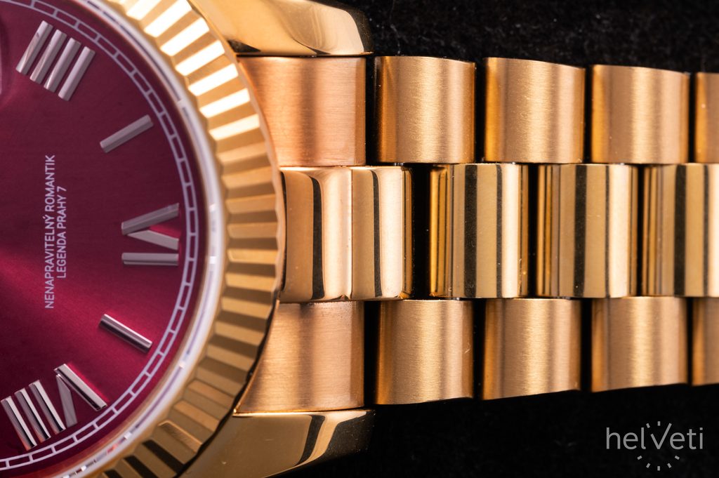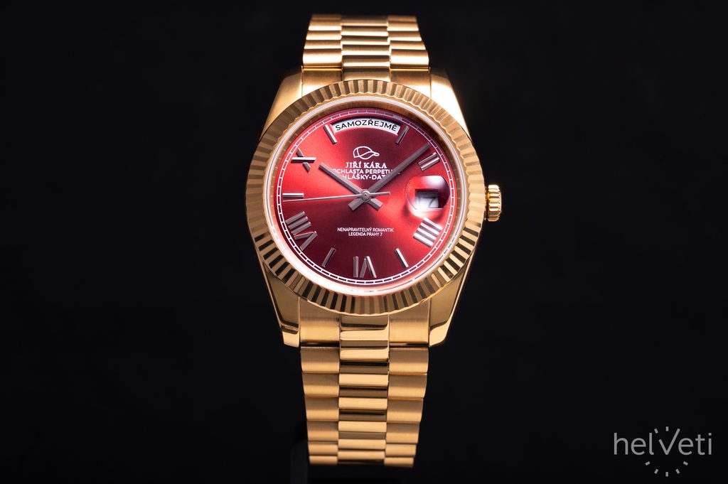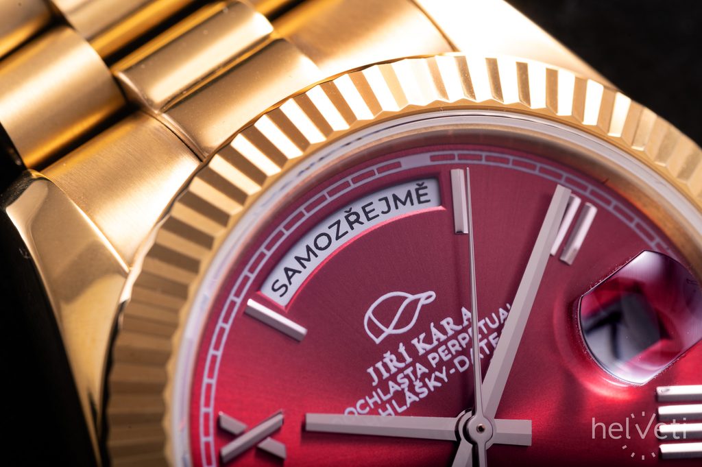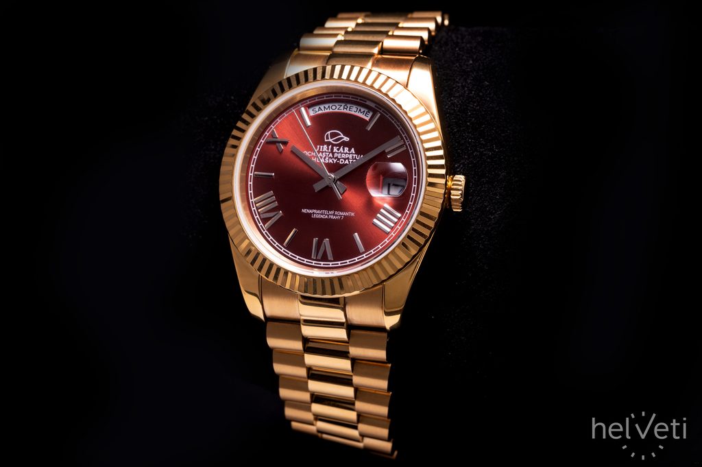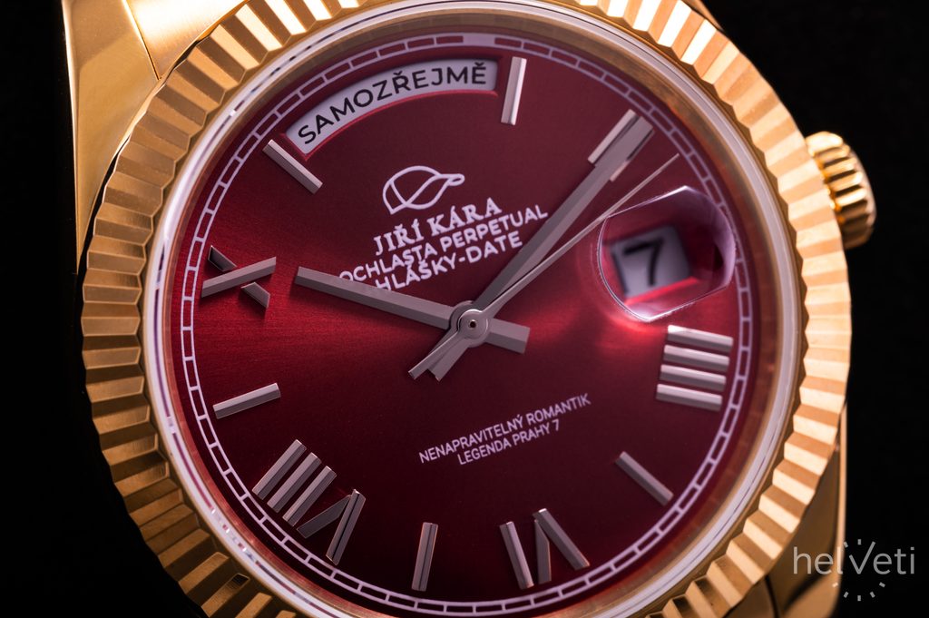 Pouzdro hodinek Jiří Kára Ochlasta Perpetual Hlášky-Date - Limitovaná edice je vyrobený z ušlechtilý oceli s PVD úpravou zlatý barvy. Ta ocel je tak ušlechtilá, jako myšlenka Jirky Káry, když se rozhodl vzít si svoji lásku Blanku. Možná že to je trochu výrazný, ale kdo chce nosit hodinky, věnovaný Jirkovi Károvi, tak musí mít trochu odvahu. Jirka Kára se taky s ničim moc nepáral a to je to, co na něm obdivujeme. Jestli si ale měkota jak Miloš Ouřada, zkus stříbrnou nelimitovanou verzi.