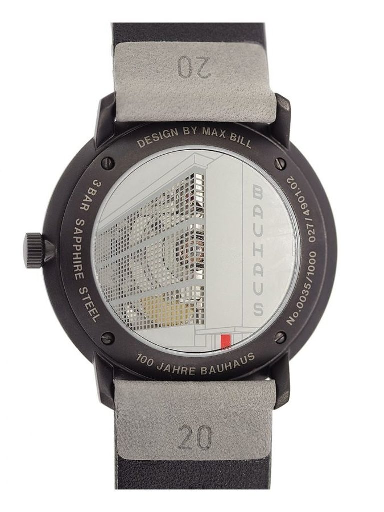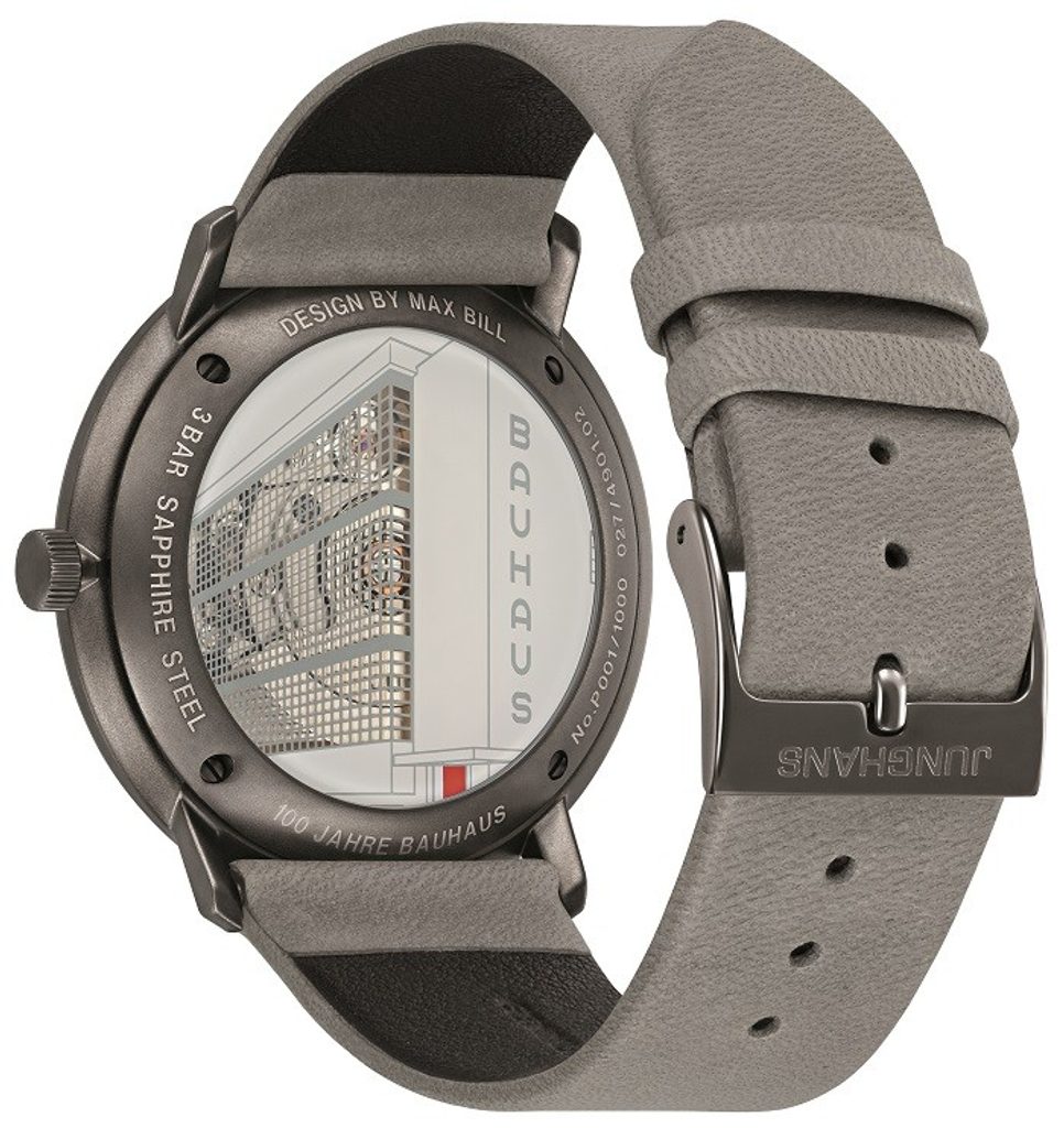 Tato unikátní limitovaná edice, vyrobená v počtu 1000 ks, byla vytvořena na počest výročí 100 let od založení umělecké akademie Bauhaus ve Výmaru. Stalo se tak roku 1919 a zakladatelem byl Walter Gropius. Na dýnku najdeme vyobrazení budovy této akademie, kde na první pohled upoutají její červené dveře. Do mřížovaných oken této budovy je pak velice nápaditě zasazen průhled na strojek J800.1. Motiv červené najdeme také na ploše ukazatele data hodinek a na ručkách. Max Bill, který pro Junghans vytvořil dnes již ikonický design číselníků řady, nesoucí jeho jméno, byl slavným propagátorem stylu Bauhaus a absolventem umělecké školy Bauhaus v Dessau.