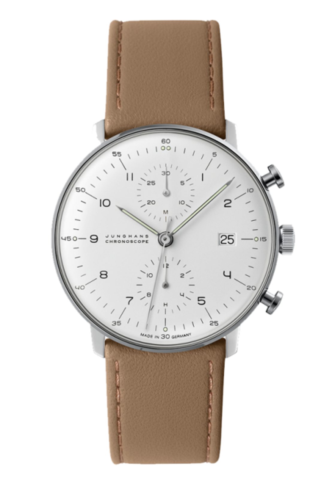 Německé hodinky Junghans Max Bill Chronoscope 027/4502.04 z řady Max Bill jsou oblíbené pro svůj čistý, nadčasový vzhled inspirovaný uměleckým stylem Bauhaus ve spojení s vysoce kvalitním zpracováním.